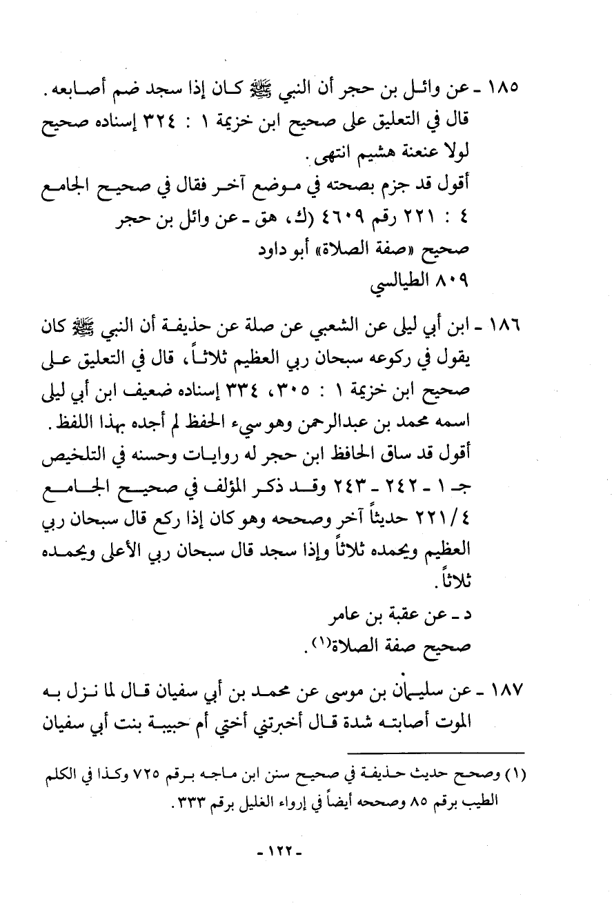 185- عن وائل بن حجر أن النبي - صلى الله عليه وسلم - كان إذا سجد ضم أصابعه. قال في التعليق على صحيح ابن خزيمة (1: 324) : إسناده صحيح لولا عنعنة هشيم. انتهى.