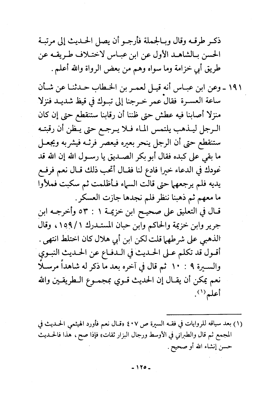 191- وعن ابن عباس أنه قيل لعمر بن الخطاب حدثنا عن شأن ساعة العسرة فقال عمر: خرجنا إلى تبوك في قيظ شديد فنزلا منزلاً أصابنا فيه عطش حتى ظننا أن رقابنا ستنقطع حتى إن كان الرجل ليذهب يلتمس الماء فلا يرجع حتى يظن أن رقبته ستنقطع حتى أن الرجل ينحر بعيره فيعصر فرثه فيشربه ويجعل ما بقي على كبده. فقال أبو بكر الصديق: يا رسول الله إن الله قد عودك في الدعاء خيرًا فادع لنا. فقال: «أتحب ذلك» . قال: نعم فرفع يديه فلم يرجعهما حتى قالت السماء فأظلمت ثم سكبت فملأوا ما معهم ثم ذهبنا ننظر فلم نجدها جازت العسكر.