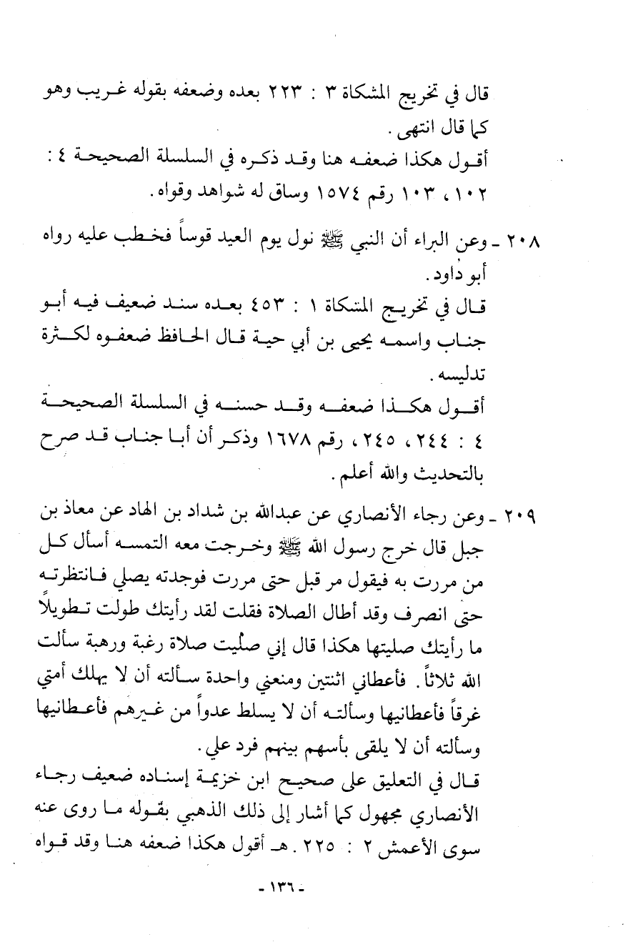 208- وعن البراء أن النبي - صلى الله عليه وسلم - نول يوم العيد قوسًا فخطب عليه. رواه أبو داود.