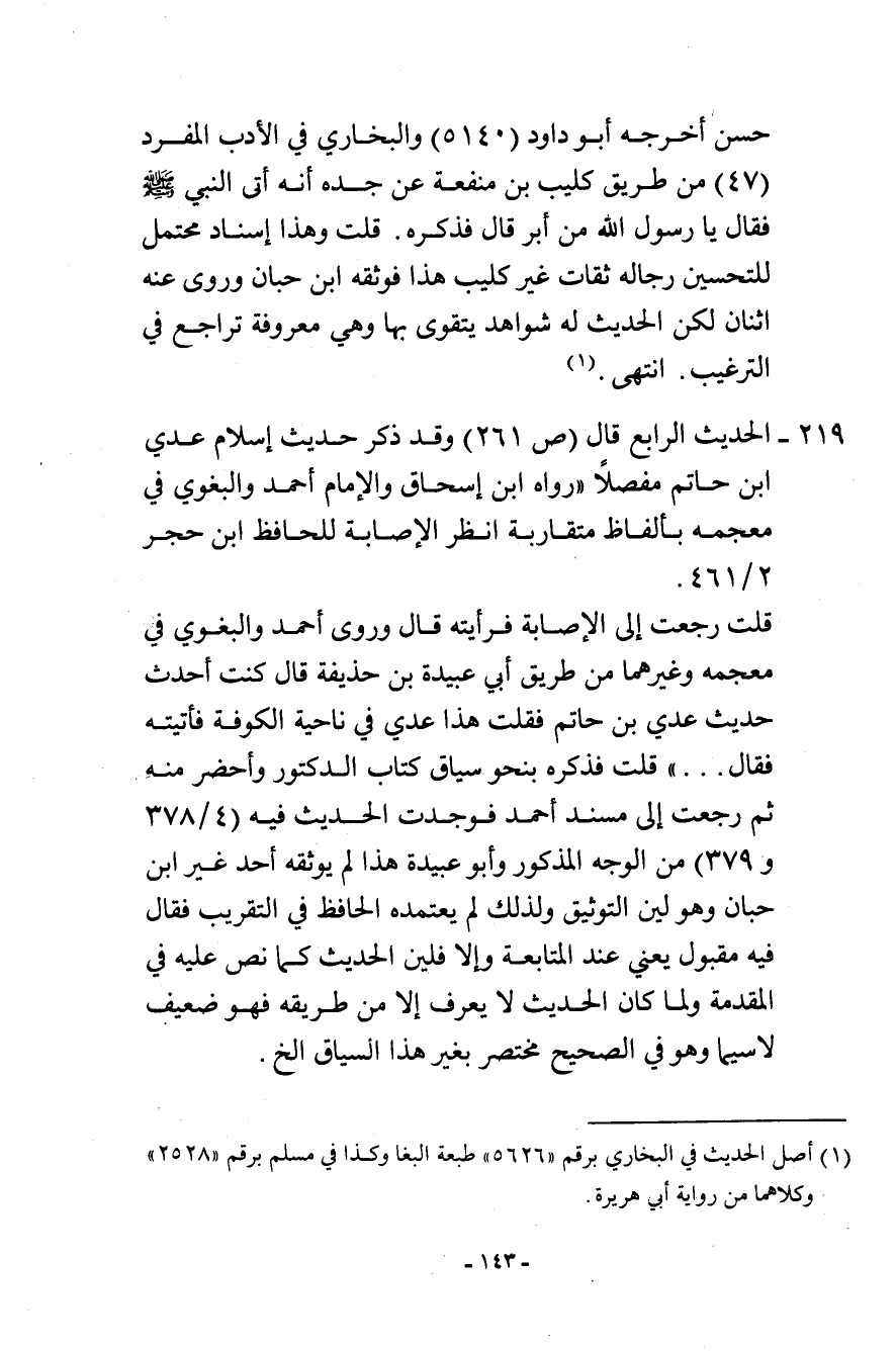 قلت: رجعت إلى الإصابة فرأيته قال: وروى أحمد والبغوي في معجمه وغيرهما من طريق أبي عبيدة بن حذيفة قال: كنت أحدث حديث عدي بن حاتم فقلت: هذا عدي في ناحية الكوفة فأتيته فقال ... )) قلت: فذكره بنحو سياق كتاب الدكتور وأحضر منه ثم رجعت إلى مسند أحمد فوجدت الحديث فيه (4/378، 379) من الوجه المذكور، وأبو عبيدة هذا لم يوثقه أحد غير ابن حبان وهو لين التوثيق ولذلك لم يعتمده الحافظ في التقريب فقال فيه: مقبول. يعني عند المتابعة وإلا فلين الحديث كما نص عليه في المقدمة ولما كان الحديث لا يعرف إلا من طريقه فهو ضعيف لا سيما وهو في الصحيح مختصر بغير هذا السياق ... إلخ.