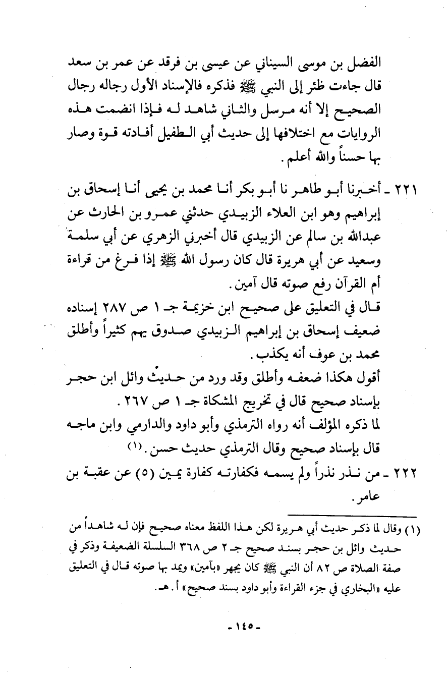 222-: «من نذر نذرًا ولم يسمه فكفارته كفارة يمين» . (5) عن عقبة بن عامر.