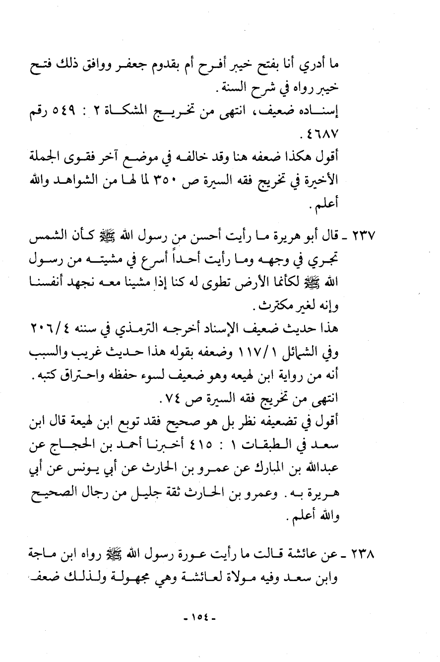 238- عن عائشة قالت: (ما رأيت عورة رسول الله - صلى الله عليه وسلم -) . رواه ابن ماجة وابن سعد وفيه مولاة لعائشة وهي مجهولة ولذلك ضعف