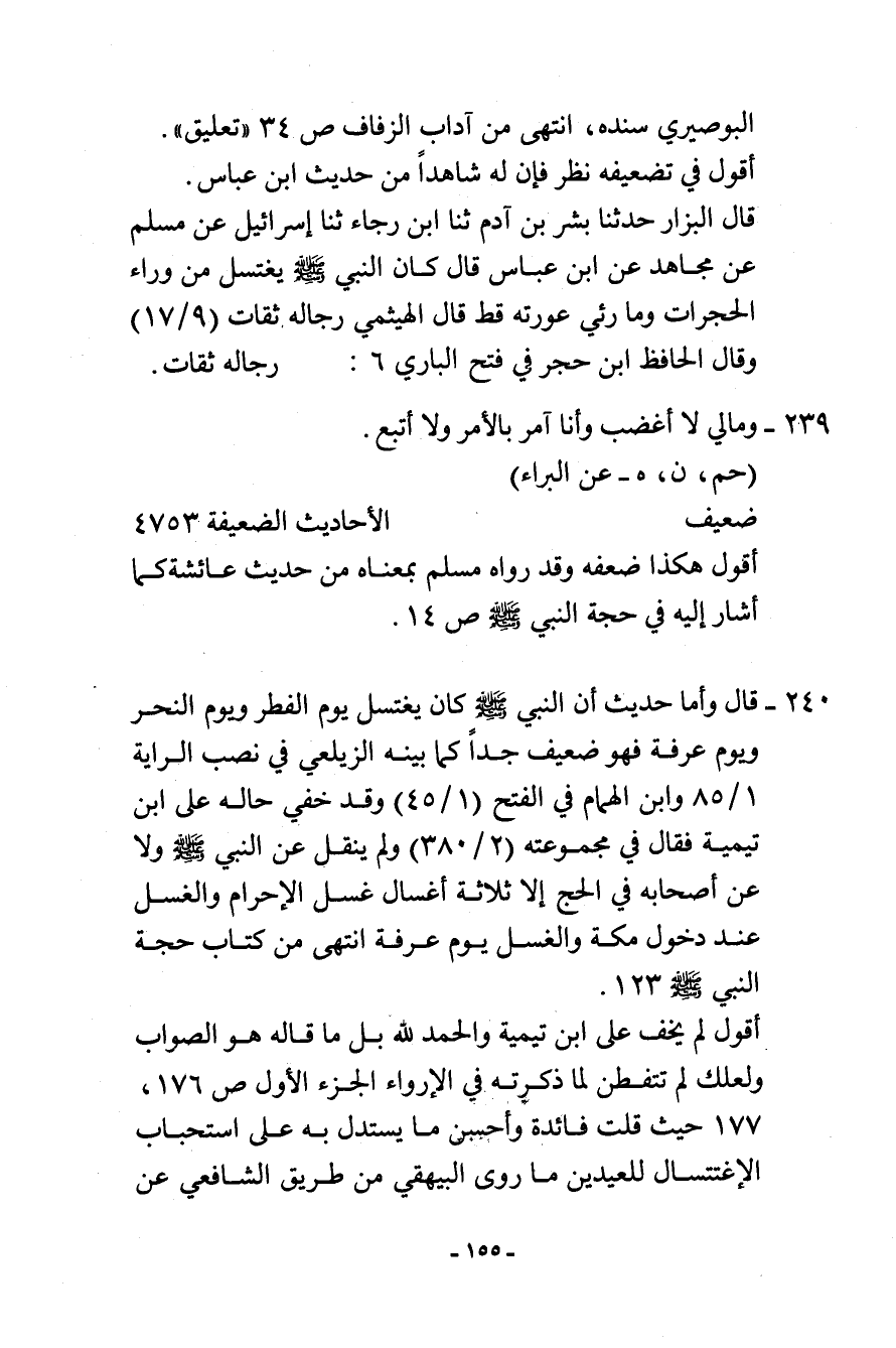 240- قال: وأما حديث أن النبي - صلى الله عليه وسلم - كان يغتسل يوم الفطر ويوم النحر ويوم عرفة. فهو ضعيف جدًا كما بينه الزيلعي في نصب الراية (1/85) ، وابن الهمام في الفتح (1/45) . وقد خفي حاله على ابن تيمية فقال: في مجموعته (2/380) ولم ينقل عن النبي - صلى الله عليه وسلم - ولا عن أصحابه في الحج إلا ثلاثة أغسال غسل الإحرام والغسل عند دخول مكة والغسل يوم عرفة. انتهى من كتاب حجة النبي - صلى الله عليه وسلم - (123) .