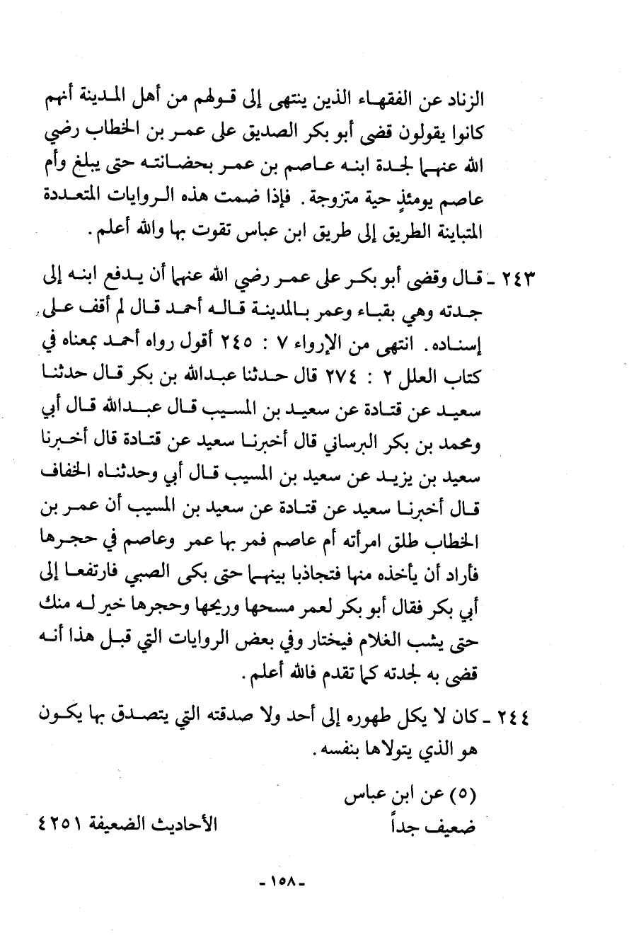 الزناد عن الفقهاء الذين ينتهي إلى قولهم من أهل المدينة أنهم كانوا يقولون قضى أبو بكر الصديق على عمر بن الخطاب رضي الله عنهما لجدة ابنه عاصم بن عمر بحضانته حتى يبلغ وأم عاصم يومئذٍ حية متزوجة. فإذا ضمنت هذه الروايات المتعددة المتباينة الطريق إلى طريق ابن عباس تقوت. والله أعلم.