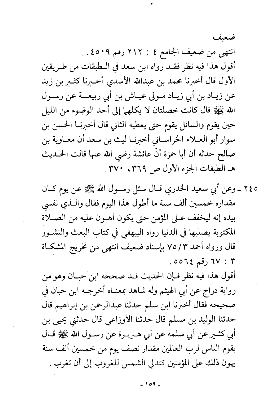 245- وعن أبي سعيد الخدري قال: سئل رسول الله - صلى الله عليه وسلم - عن يوم كان مقداره خمسين ألف سنة ما أطول هذا اليوم فقال: «والذي نفسي بيده ... إنه ليخفف على المؤمن حتى يكون أهون عليه من الصلاة المكتوبة يصليها في الدنيا» . رواه البيهقي في كتاب البعث والنشور قال: ورواه أحمد (3/75) بإسناد ضعيف. انتهى من تخريج المشكاة (3: 67) رقم (5564) .