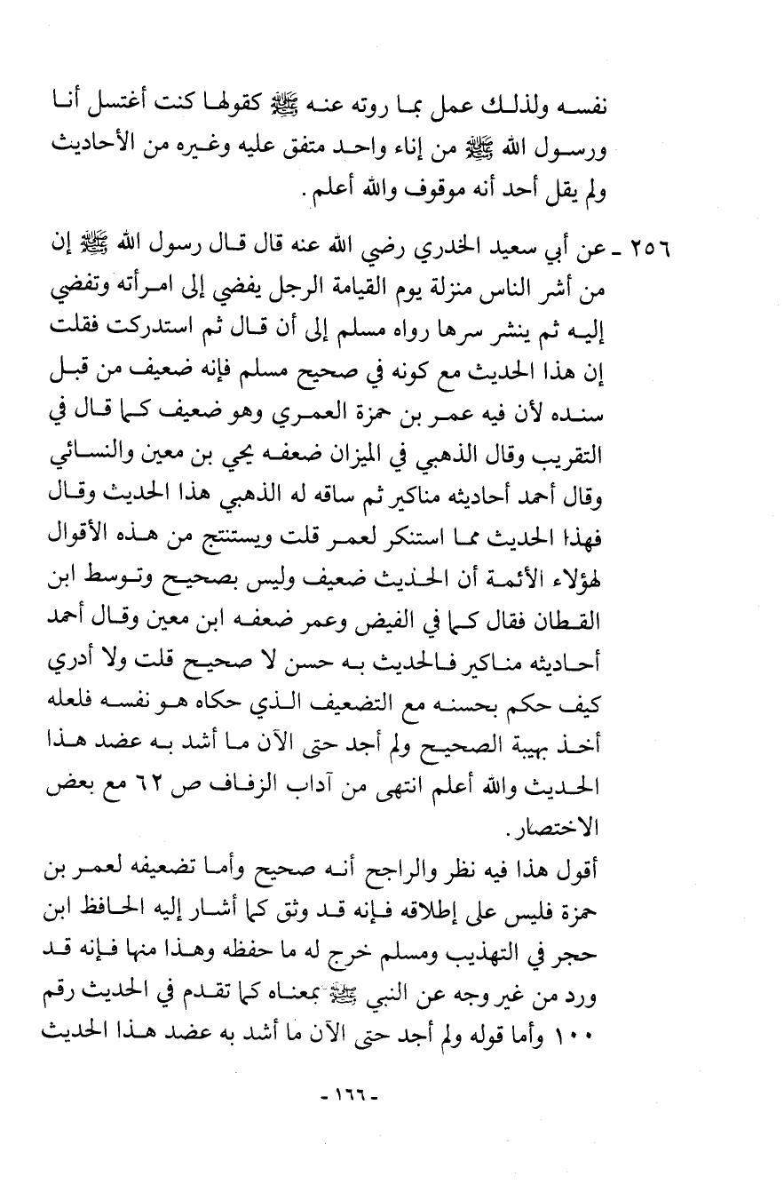 ثم استدركت فقلت: إن هذا الحديث مع كونه في ((صحيح مسلم)) فإنه ضعيف من قبل سنده لأن فيه عمر بن حمزة العمري وهو ضعيف كما قال في ((التقريب)) . وقال الذهبي في ((الميزان)) : ضعفه يحيى بن معين والنسائي وقال أحمد: أحاديثه مناكير. ثم ساق له الذهبي هذا الحديث وقال: فهذا الحديث مما استنكر لعمر ".