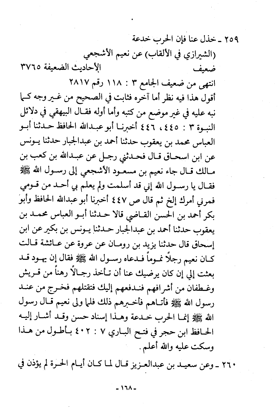 أقول: هذا فيه نظر، أما آخره فثابت في الصحيح من غير وجه كما نبه عليه في غير موضع من كتبه. وأما أوله فقال البيهقي في دلائل النبوة (3: 445، 446) : أخبرنا أبو عبد الله الحافظ حدثنا أبو العباس محمد بن يعقوب حدثنا أحمد بن عبد الجبار حدثنا يونس عن ابن إسحاق قال: فحدثني رجل عن ... عبد الله بن كعب بن مالك قال: جاء نعيم بن مسعود الأشجعي إلى ... رسول الله - صلى الله عليه وسلم - فقال: يا رسول الله إني قد أسلمت ولم يعلم بي أحد من قومي فمرني أمرك ... إلخ. ثم قال (ص 447) أخبرنا أبو عبد الله الحافظ وأبو بكر أحمد بن الحسن القاضي قالا حدثنا أبو العباس محمد بن يعقوب حدثنا أحمد بن عبد الجبار حدثنا يونس بن بكير عن ابن إسحاق قال: حدثنا يزيدٍ بن رومان عن عروة عن عائشة قالت: كان نعيم رجلاً نمومًا فدعاه رسول الله - صلى الله عليه وسلم - فقال: «إن يهود قد بعثت إليَّ إن كان يرضيك عنا أن تأخذ رجالاً رهنًا من قريش وغطفان من أشرافهم فندفعهم إليك فتقتلهم» . فخرج من عند رسول الله - صلى الله عليه وسلم - فأتاهم فأخبرهم ذلك فلما ولى نعيم قال رسول الله - صلى الله عليه وسلم -: «إنما الحرب خدعة» . وهذا إسناد حسن وقد أشار إليه الحافظ ابن حجر في فتح الباري (7: 402) بأطول من هذا. وسكت عليه. والله أعلم.