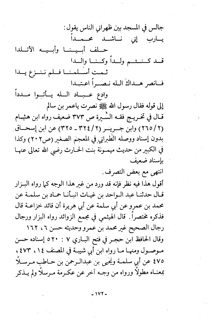 قال في تخريج فقه السيرة (ص 373) : ضعيف. رواه ابن هشام (2/265) ، وابن جرير (2/324-325) عن ابن إسحاق بدون إسناد، وصله الطبراني في المعجم الصغير (ص 202) ، وكذا في الكبير من حديث ميمونة بنت الحارث رضي الله تعالى عنها بإسناد ضعيف