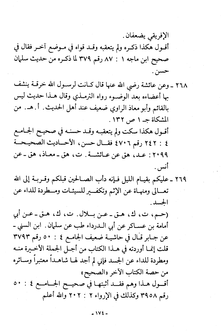269- " عليكم بقيام الليل فإنه دأب الصالحين قبلكم وقربة إلى الله تعالى ومنهاة عن الإثم وتكفير للسيئات ومطردة للداء عن الجسد» .