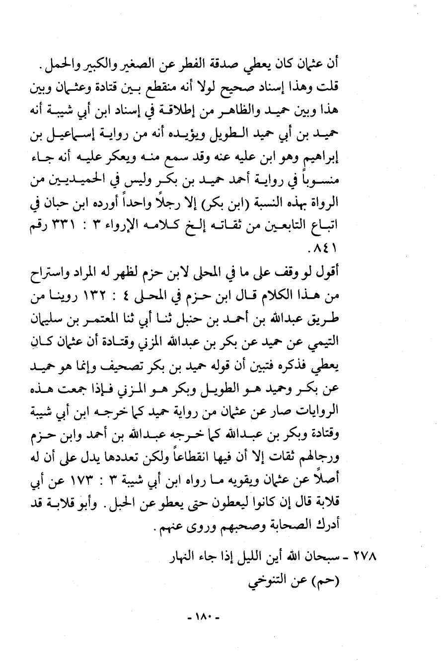 أقول: لو وقف على ما في المحلى لابن حزم لظهر له المراد واستراح من هذا الكلام. قال ابن حزم في المحلى (4: 132) روينا من طريق عبد الله بن أحمد بن حنبل ثنا أبي ثنا المعتمر بن سليمان التيمي عن حميد عن بكر بن عبد الله المزني وقتادة أن عثمان كان يعطي ... فذكره. فتبين أن قوله حميد بن بكر تصحيف وإنما هو حميد عن بكر وحميد هو الطويل وبكر هو المزني فإذا جمعت هذه الروايات صار عن عثمان من رواية حميد كما خرجه ابن أبي شيبة وقتادة وبكر بن عبد الله كما خرجه عبد الله بن أحمد وابن حزم ورجالهم ثقات إلا أن فيها انقطاعًا، ولكن تعددها يدل على أن له أصلاً عن عثمان ويقويه ما رواه ابن أبي شيبة (3: 173) عن أبي قلابة قال: إن كانوا ليعطون حتى يعطو عن الحبل. وأبو قلابة قد أدرك الصحابة وصحبهم وروى عنهم.