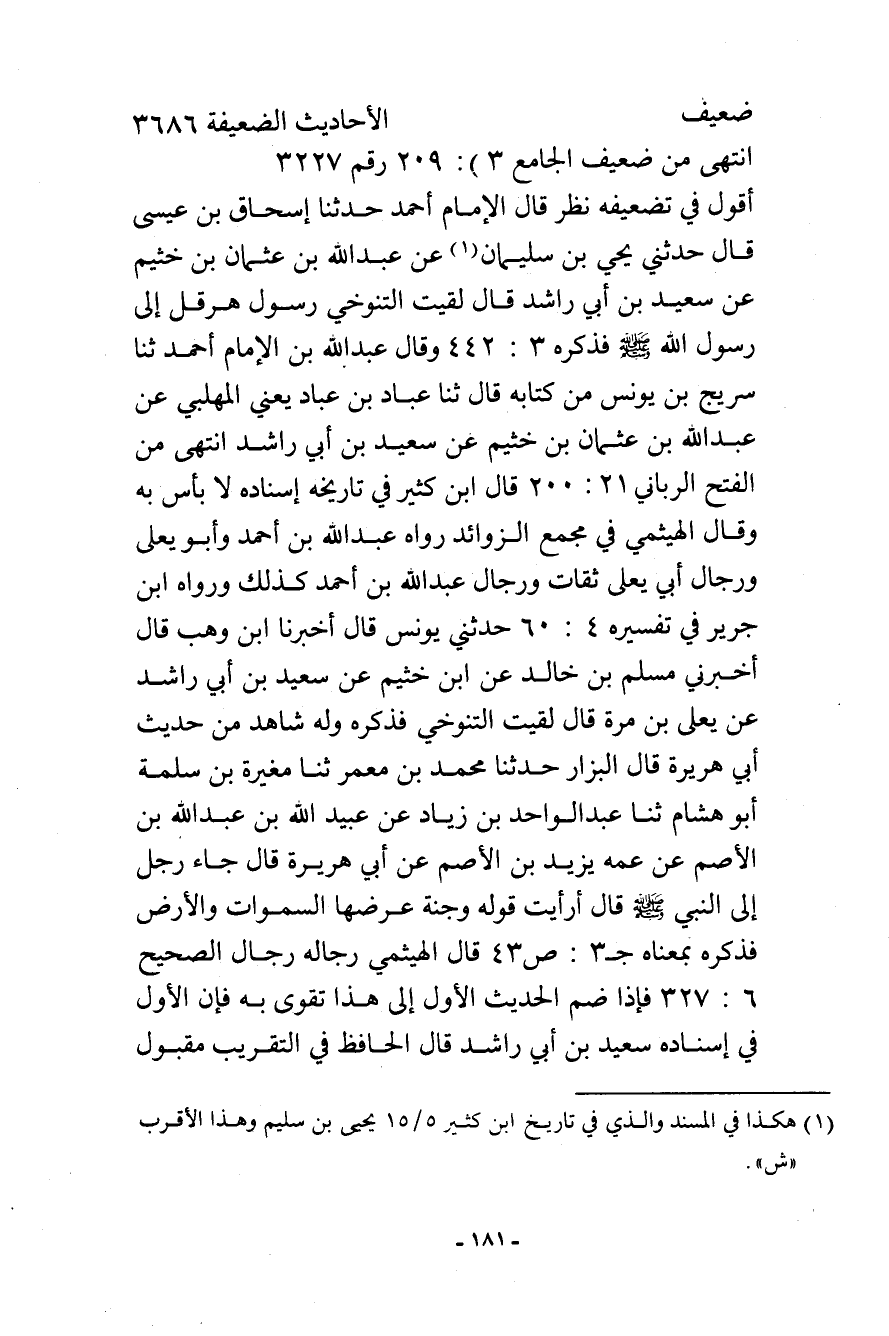 أقول: في تضعيفه نظر، قال الإمام أحمد حدثنا إسحاق بن عيسى قال حدثني يحيى بن سليمان (¬1) عن عبد الله بن عثمان بن خثيم عن سعيد بن أبي راشد قال: لقيت التنوخي رسول هرقل إلى رسول الله - صلى الله عليه وسلم - فذكره (3: 442) وقال عبد الله بن الإمام أحمد ثنا سريج بن يونس من كتابه قال ثنا عباد بن عباد يعني المهلبي عن عبد الله بن عثمان بن خثيم عن سعيد بن أبي راشد. انتهى من الفتح الرباني (21: 200) قال ابن كثير في تاريخه: إسناده لا بأس به. وقال الهيثمي في مجمع الزوائد رواه عبد الله بن أحمد وأبو يعلى ورجال أبي يعلى ثقات، ورجال عبد الله بن أحمد كذلك. ورواه ابن جرير في تفسيره (4: 60) حدثني يونس قال أخبرنا ابن وهب قال أخبرني مسلم بن خالد عن ابن خثيم عن سعيد بن أبي راشد عن يعلى بن مرة قال: لقيت التنوخي ... فذكره. وله شاهد من حديث أبي هريرة. قال البزار: حدثنا محمد بن معمر ثنا مغيرة بن سلمة أبو هشام ثنا عبد الواحد بن زياد عن عبيد الله بن عبد الله بن الأصم عن عمه ... يزيد بن الأصم عن أبي هريرة قال: جاء رجل إلى النبي - صلى الله عليه وسلم - قال: أرأيت قوله وجنة عرضها السموات والأرض ... فذكره بمعناه جـ (3) : ص (43) قال الهيثمي: رجاله رجال الصحيح (6: 327) فإذا ضم الحديث الأول إلى هذا تقوى به فإن الأول في إسناده سعيد بن أبي راشد قال الحافظ في التقريب: مقبول.