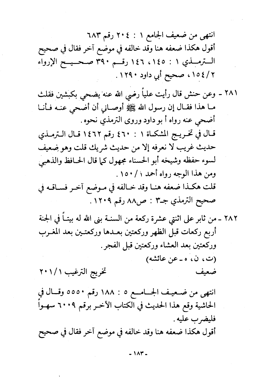 أقول: هكذا ضعفه هنا، وقد خالفه في موضع آخر فقال في صحيح الترمذي (1: 145، 146) رقم (390) صحيح الإرواء (2/154) ، صحيح أبي داود (1290) .
