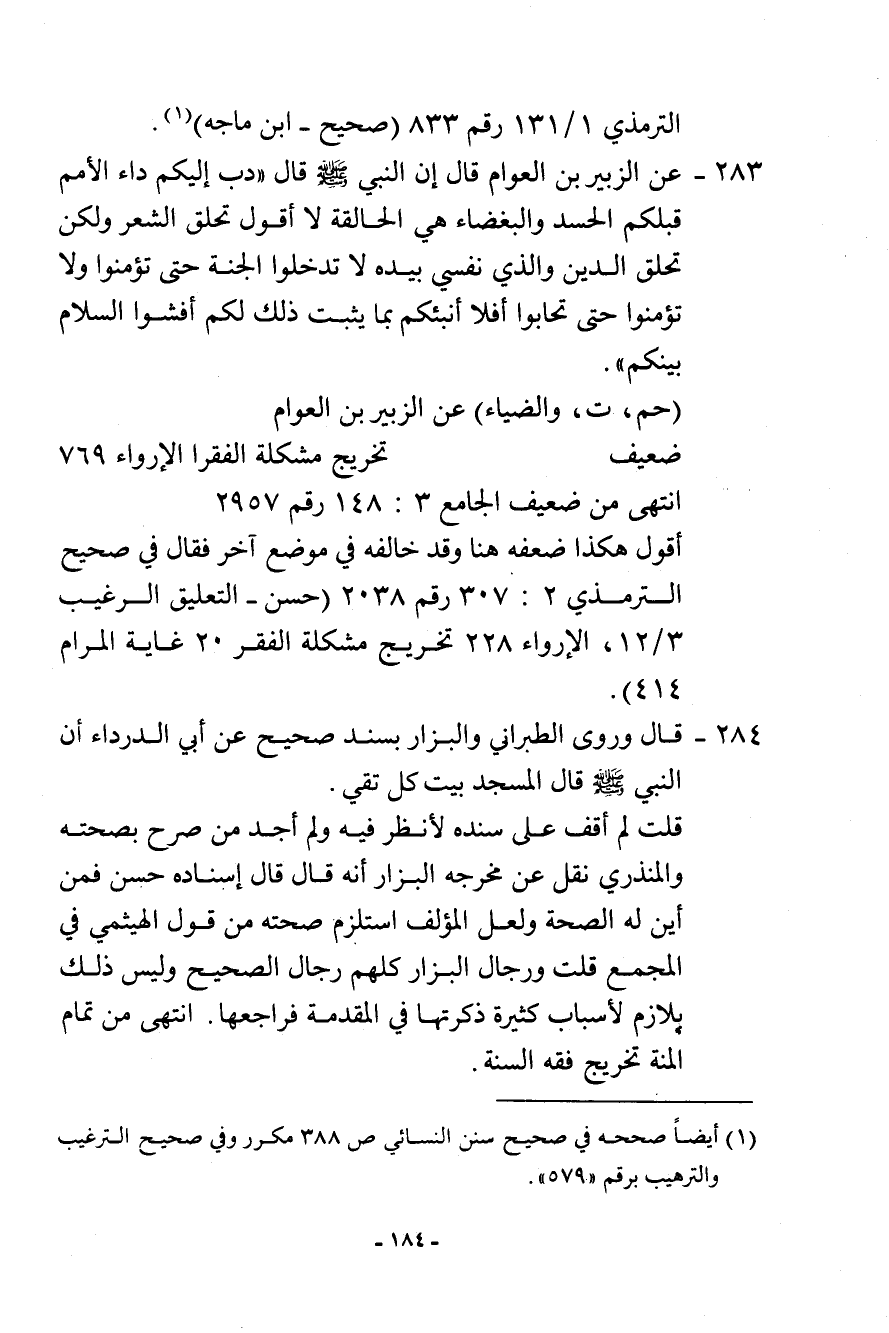 283- عن الزبير بن العوام قال: إن النبي - صلى الله عليه وسلم - قال «دب إليكم داء الأمم قبلكم الحسد والبغضاء هي الحالقة لا أقول تحلق الشعر ولكن تحلق الدين، والذي نفسي بيده لا تدخلوا الجنة حتى تؤمنوا ولا تؤمنوا حتى تحابوا أفلا أنبئكم بما يثبت ذلك لكم أفشوا السلام بينكم» .