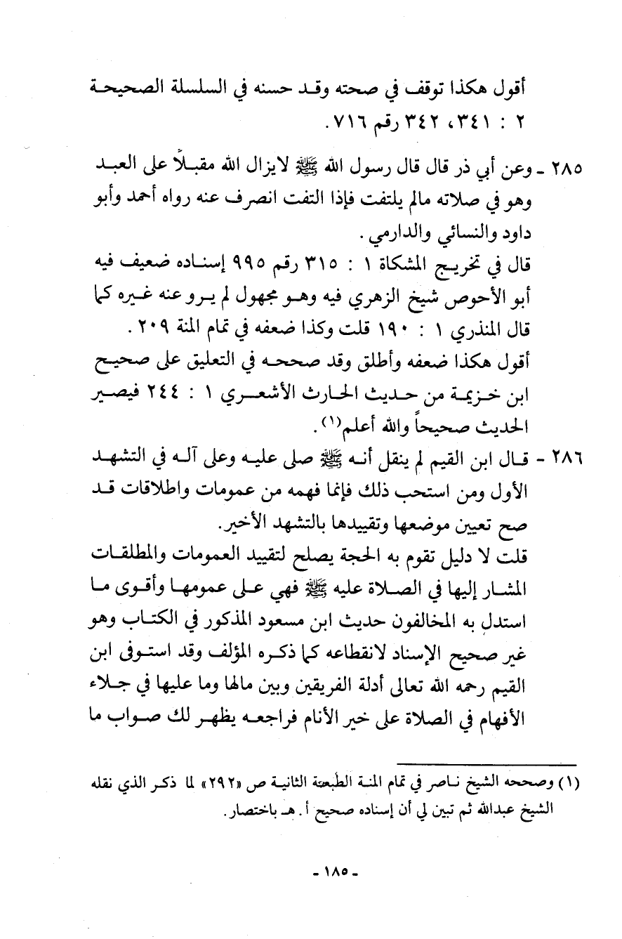 286- قال ابن القيم: لم ينقل أنه صلى الله عليه وسلم صلى عليه وعلى آله في التشهد الأول. ومن استحب ذلك فإنما فهمه من عمومات وإطلاقات قد صح تعيين موضعها وتقييدها بالتشهد الأخير ".