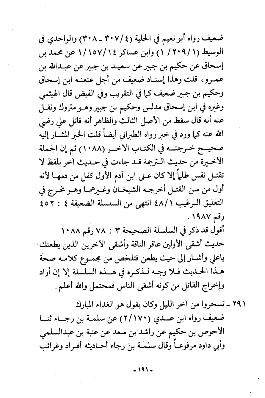 ضعيف. رواه أبو نعيم في الحلية (4/307-308) ، والواحدي في الوسيط (1/209/1) ، وابن عساكر (14/157/1) عن محمد بن إسحاق عن حكيم بن جبير عن سعيد بن جبير عن عبد الله بن عمرو قلت: وهذا إسناد ضعيف من أجل عنعنة ابن إسحاق، وحكيم بن جبير ضعيف كما في التقريب وفي الفيض قال الهيثمي وغيره في ابن إسحاق مدلس وحكيم بن جبير وهو متروك ونقل عنه أنه قال سقط من الأصل الثالث والظاهر أنه قاتل علي رضي الله عنه كما ورد في خبر رواه الطبراني أيضًا. قلت: الخبر المشار إليه صحيح خرجته في الكتاب الآخر (1088) ثم إن الجملة الأخيرة من حديث الترجمة قد جاءت في حديث آخر بلفظ: «لا تقتل نفس ظلمًا إلا كان على ابن آدم الأول كفل من دمها؛ لأنه أول من سن القتل» . أخرجه الشيخان وغيرهما وهو مخرج في التعليق الرغيب (1/48) . انتهى من السلسلة الضعيفة (4: 452) رقم (1987) .