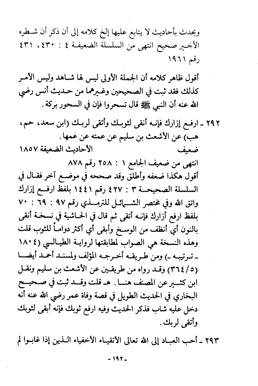 292- ارفع إزارك فإنه أنقى لثوبك وأتقى لربك. (ابن سعد، حم، هب) عن الأشعث بن سليم عن عمته عن عمها.