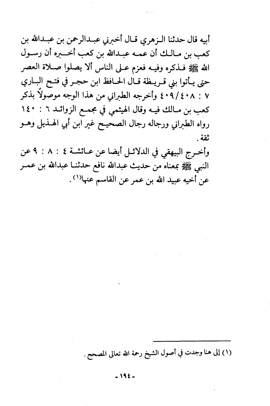 أبيه قال: حدثنا الزهري قال: أخبرني عبد الرحمن بن ... عبد الله بن كعب بن مالك أن عمه عبد الله بن كعب أخبره أن رسول الله - صلى الله عليه وسلم - ... فذكره. وفيه فعزم على الناس ألا يصلوا صلاة العصر حتى يأتوا بني قريظة. قال الحافظ ابن حجر في فتح الباري (7: 408/409) : وأخرجه الطبراني من هذا الوجه موصولاً بذكر كعب بن مالك فيه. وقال الهيثمي في مجمع الزوائد (6: 140) رواه الطبراني ورجاله رجال الصحيح غير ابن أبي الهذيل وهو ثقة.