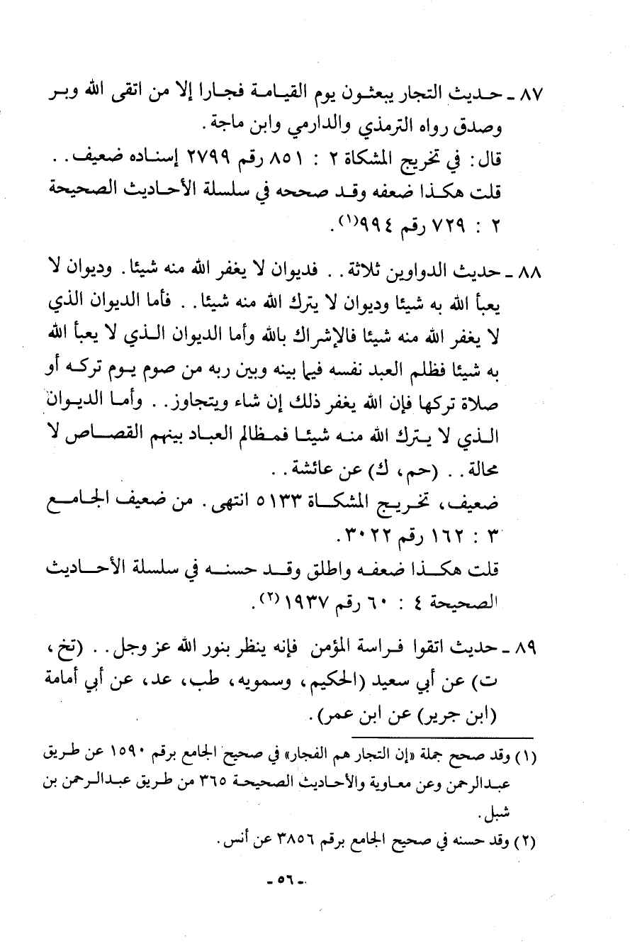 (¬1) وقد صحح جملة «إن التجار هم الفجار» في صحيح الجامع برقم 1590 عن طريق عبد الرحمن وعن معاوية والأحاديث الصحيحة 365 من طريق عبد الرحمن بن شبل.