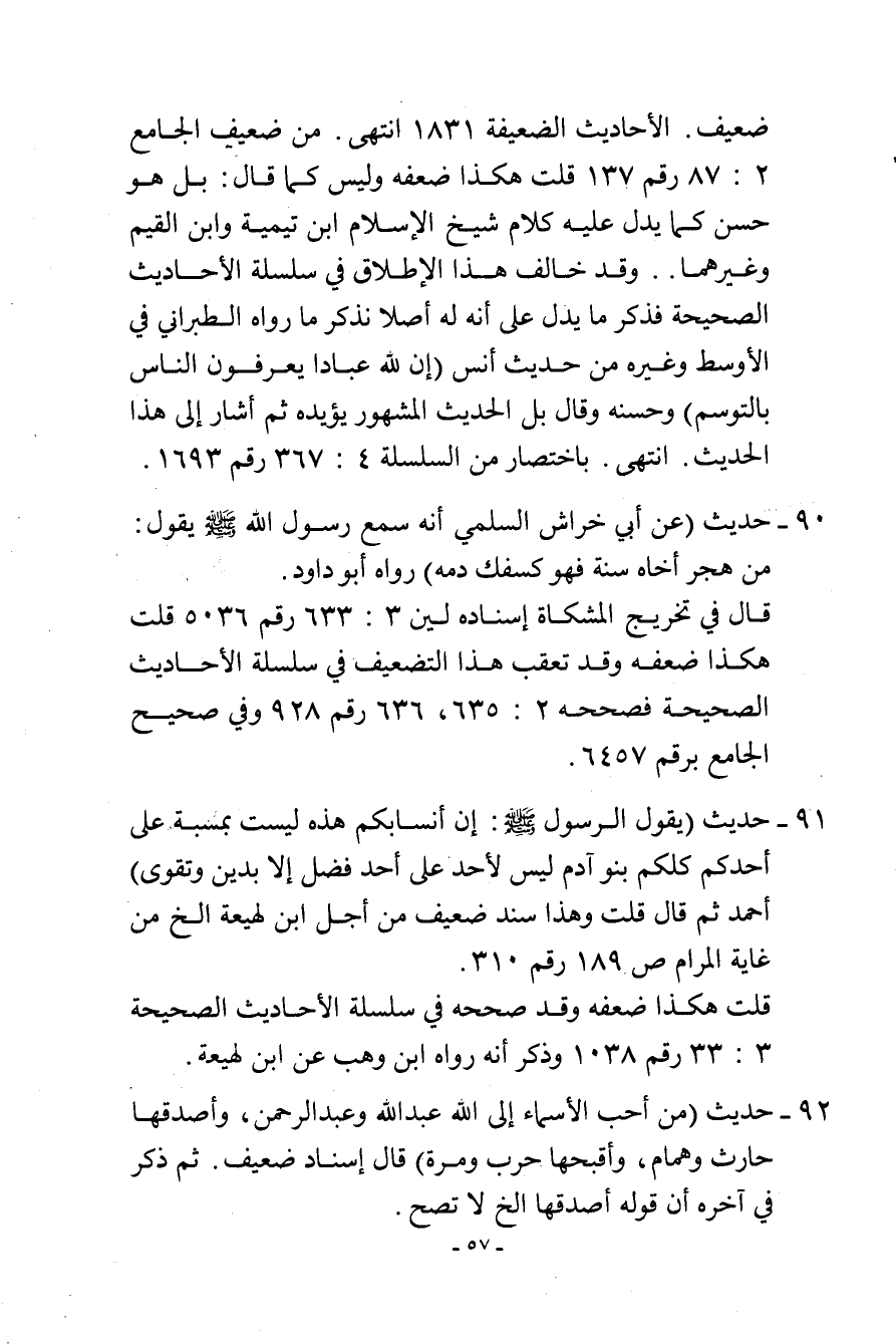 91- حديث (يقول الرسول - صلى الله عليه وسلم -: «إن أنسابكم هذه ليست بمسبة على أحدكم، كلكم بنوا آدم ليس لأحد على أحد فضل إلا بدين وتقوى» . أحمد ثم قال: قلت: وهذا سند ضعيف من أجل ابن لهيعة إلخ من غاية المرام (ص 189) رقم (310) .