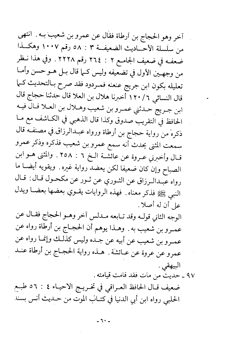 آخر وهو الحجاج بن أرطاة فقال: عن عمرو بن شعيب به. انتهى من سلسلة الأحاديث الضعيفة (3: 58) رقم (1007) ، وهكذا ضعفه في ضعيف في الجامع (2: 264) رقم (2228) . وفي هذا نظر من وجهين: الأول: في تضعيفه وليس كما قال: بل هو حسن، وأما تعليله بكون ابن جريج عنعنه فمردود فقد صرح بالتحديث كما قال النسائي (6/120) : أخبرنا هلال بن العلا قال حدثنا حجاج قال ابن جريج: حدثني عمرو بن شعيب وهلال بن العلا قال فيه الحافظ في التقريب: صدوق. وكذا قال الذهبي في الكاشف مع ما ذكره من رواية الحجاج بن أرطاة. ورواه عبد الرزاق في مصنفه قال: سمعت المثنى يحدث أنه سمع عمرو بن شعيب فذكره وذكر عمرو. قال: وأخبرني عروة عن عائشة إلخ (6: 258) . والمثنى هو ابن الصباح وإن كان ضعيفًا لكن يعضد رواية غيره. ويقويه أيضًا ما رواه عبد الرزاق عن الثوري عن ثور عن مكحول قال: قال النبي - صلى الله عليه وسلم - فذكر معناه. فهذه الروايات يقوي بعضها بعضًا ويدل على أن له أصلاً.