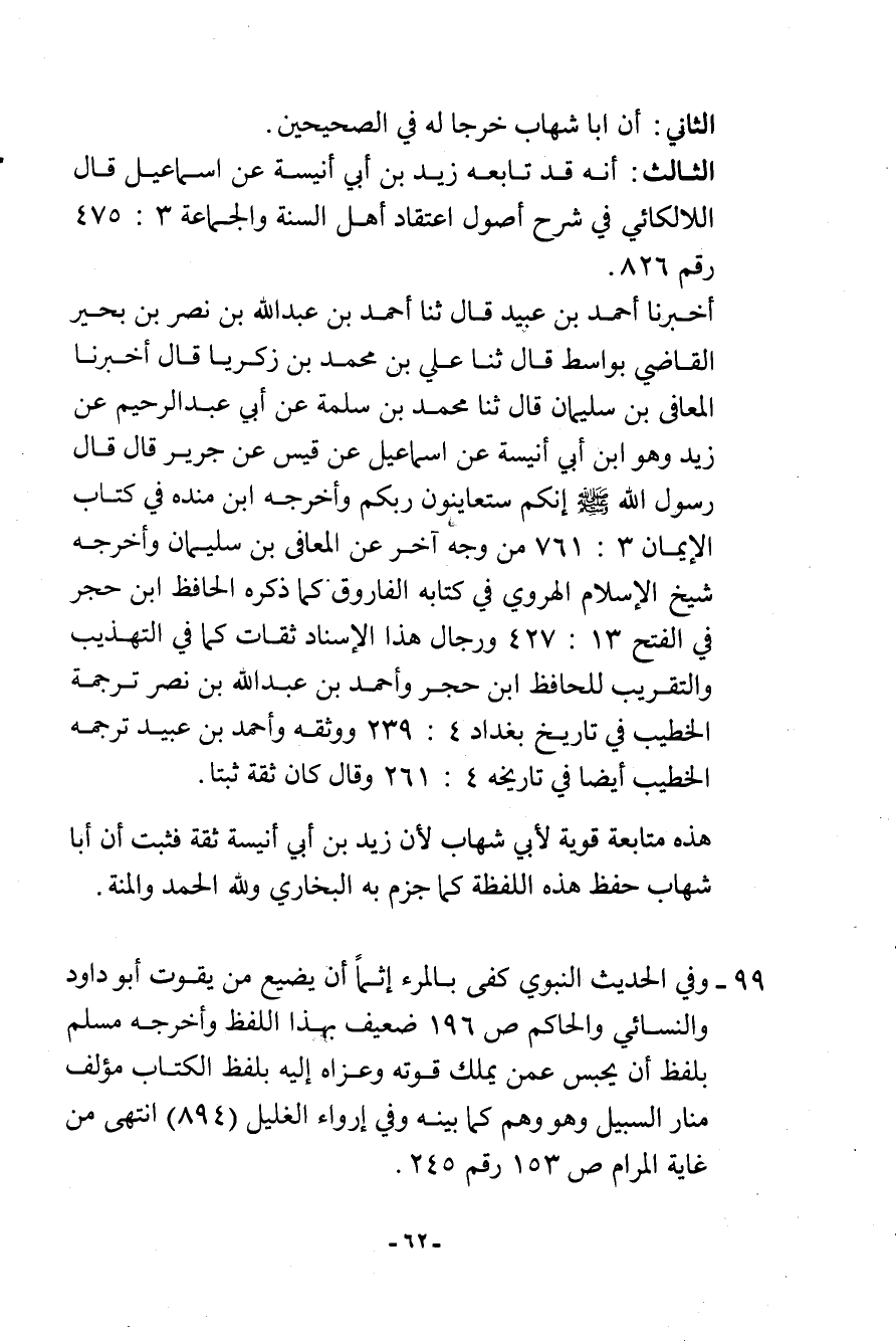 هذه متابعة قوية لأبي شهاب لأن زيد بن أبي أنيسة ثقة فثبت أن أبا شهاب حفظ هذه اللفظة كما جزم به البخاري ولله الحمد والمنة.