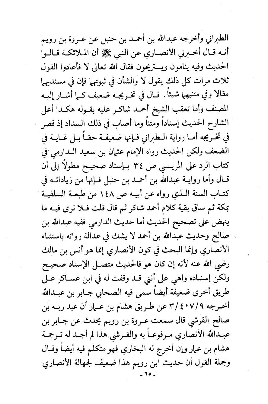 الطبراني وأخرجه عبد الله بن أحمد بن حنبل عن ... عروة بن رويم أنه قال أخبرني الأنصاري عن النبي - صلى الله عليه وسلم - (أن الملائكة قالوا ... الحديث. وفيه: ينامون ويستريحون. فقال الله تعالى: لا فأعادوا القول ثلاث مرات كل ذلك يقول: لا. والشأن في ثبوتهما فإن في مسنديهما مقالاً وفي متنيهما شيئًا. قال في تخريجه: ضعيف كما أشار إليه المصنف. وأما تعقب الشيخ أحمد شاكر عليه بقوله: هكذا أعل الشارح الحديث إسنادًا ومتنًا وما أصاب في ذلك السداد إذ قصر في تخريجه، أما رواية الطبراني فإنها ضعيفة حقًا بل الغاية في الضعف، ولكن الحديث رواه الإمام عثمان بن سعيد الدارمي في كتاب الرد على المريسي (ص 34) بإسناد صحيح مطولاً إلى أن قال: وأما رواية ... عبد الله بن أحمد بن حنبل فإنها من زياداته في كتاب السنة الذي رواه عن أبيه (ص 148) من طبعة السلفية بمكة ثم ساق بقية كلام أحمد شاكر ثم قال: قلت: فلا نرى فيه ما ينهض على تصحيح الحديث. أما حديث الدارمي ففيه عبد الله بن صالح وحديث عبد الله بن أحمد لا يشك في عدالة رواته باستثناء الأنصاري. وإنما البحث في كون الأنصاري إنما هو أنس بن مالك رضي الله عنه لأنه إن كان هو فالحديث متصل الإسناد صحيح، ولكن إسناده واهي على أنني قد وقفت له في ابن عساكر على طريق أخرى ضعيفة أيضًا سمي فيه الصحابي جابر بن عبد الله أخرجه (9/407/3) عن طريق هشام بن عمار أن عبد ربه بن صالح القرشي قال: سمعت عروة بن رويم يحدث عن جابر بن عبد الله الأنصاري مرفوعًا به.
