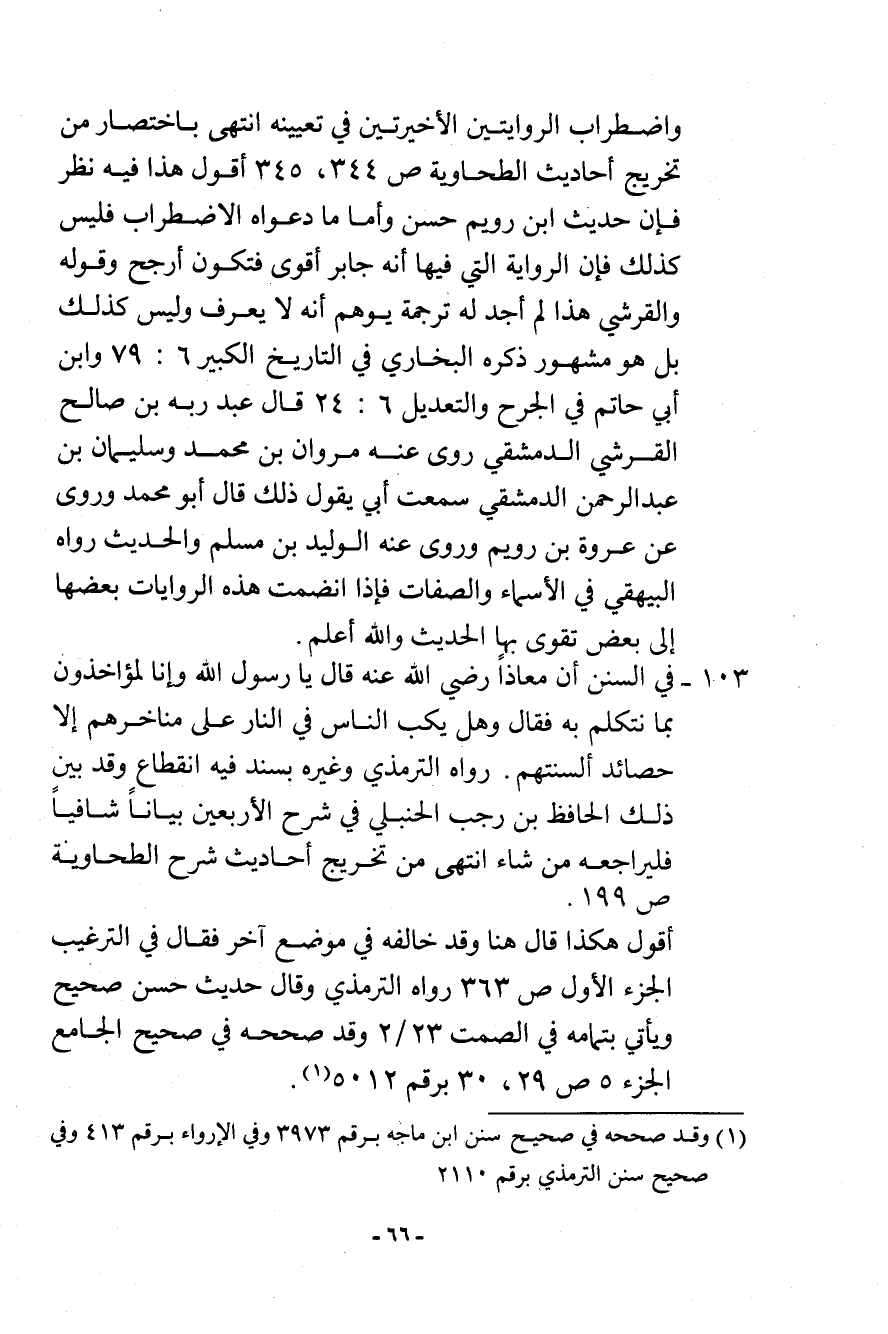 103- في السنن أن معاذًا رضي الله عنه قال: يا رسول الله وإنا لمؤاخذون بما نتكلم به؟ فقال: «وهل يكب الناس في النار على مناخرهم إلا حصائد ألسنتهم» . رواه الترمذي وغيره بسند فيه انقطاع وقد بين ذلك الحافظ بن رجب الحنبلي في شرح الأربعين بيانًا شافيًا فليراجعه من شاء. انتهى من تخريج أحاديث شرح الطحاوية (ص 199) .