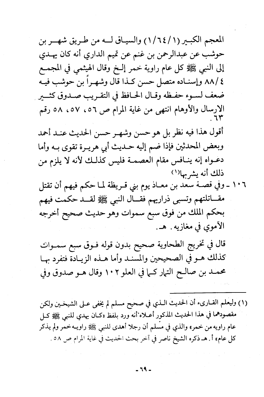 (¬1) وليعلم القارئ أن الحديث الذي في صحيح مسلم لم يخفى على الشيخين ولكن مقصودهما في هذا الحديث المذكور أعلاه أنه ورد بلفظ (كان يهدي للنبي - صلى الله عليه وسلم - ?كل عام راوية من خمر) والذي في مسلم أن رجلاً أهدى للنبي - صلى الله عليه وسلم - ?روية خمر ولم يذكر كل عام أ. هـ. ذكره الشيخ ناصر في آخر بحث الحديث في غاية المرام (ص 58) .