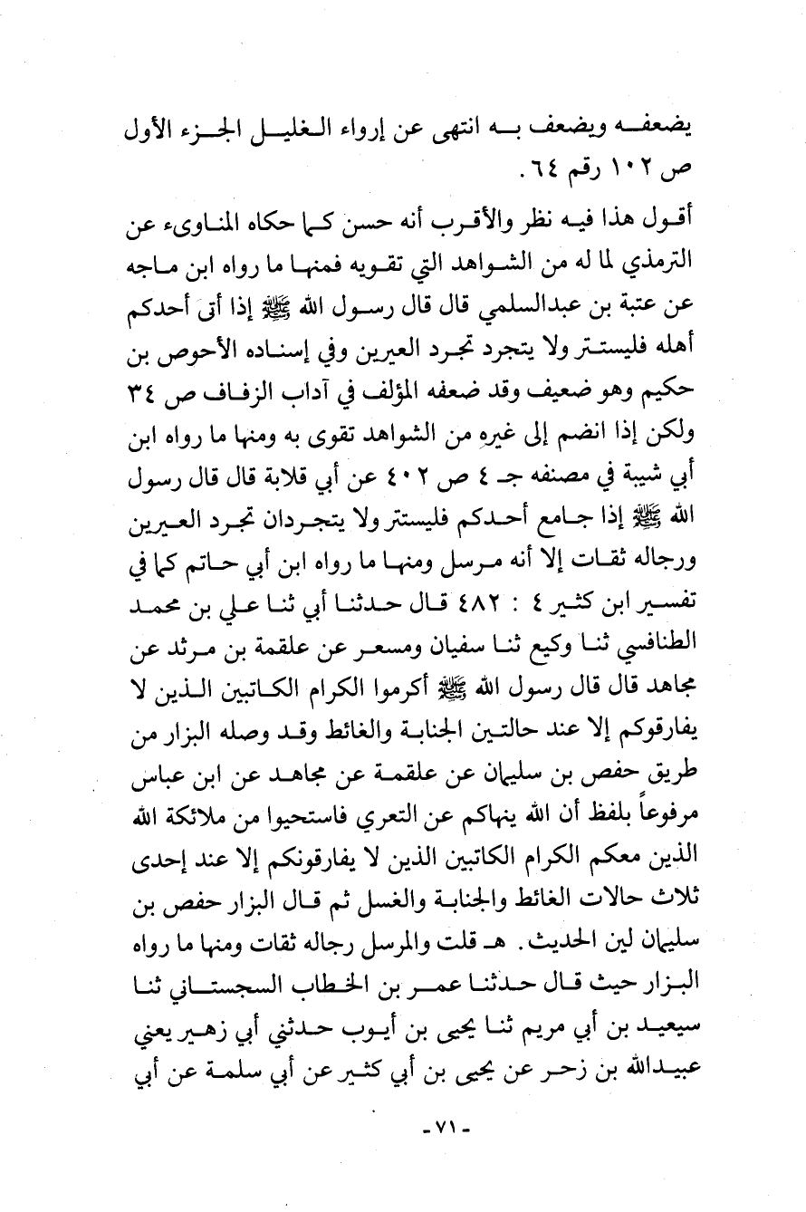 أقول: هذا فيه نظر والأقرب أنه حسن كما حكاه المناوي عن الترمذي لما له من الشواهد التي تقويه فمنها ما رواه ابن ماجة عن عتبة بن عبد السلمي قال: قال رسول الله - صلى الله عليه وسلم -: «إذا أتى أحدكم أهله فليستتر ولا يتجرد تجرد العيرين» . وفي إسناده الأحوص بن حكيم وهو ضعيف، وقد ضعفه المؤلف في آداب الزفاف (ص 34) ولكن إذا انضم إلى غيره من الشواهد تقوى به. ومنها ما رواه ابن أبي شيبة في مصنفه (جـ 4 ص 402) عن أبي قلابة قال: قال رسول الله - صلى الله عليه وسلم -: «إذا جامع أحدكم فليستتر ولا يتجردان تجرد العيرين» . ورجاله ثقات إلا أنه مرسل. ومنها ما رواه ابن أبي حاتم كما في تفسير ابن كثير (4: 428) قال: حدثنا أبي ثنا علي بن محمد الطنافسي ثنا وكيع ثنا سفيان ومسعر عن علقمة بن مرثد عن مجاهد قال: قال رسول الله: «أكرموا الكرام الكاتبين الذين لا يفارقوكم إلا عند حالتين الجنابة والغائط» وقد وصله البزار من طريق حفص بن سليمان عن علقمة عن مجاهد عن ابن عباس مرفوعًا بلفظ: «إن الله ينهاكم عن التعري فاستحيوا من ملائكة الله الذين معكم، الكرام الكاتبين، الذين لا يفارقونكم إلا عند إحدى ثلاث حالات: الغائط، والجنابة، والغسل» . ثم قال البزار: حفص بن سليمان لين الحديث. هـ قلت: والمرسل رجاله ثقات. ومنها ما رواه البزار حيث قال: حدثنا عمر بن الخطاب السجستاني ثنا سعيد بن أبي مريم ثنا يحيى بن أيوب حدثني أبي زهير يعني ... عبيد الله بن زحر عن يحيى بن أبي كثير عن أبي سلمة عن أبي