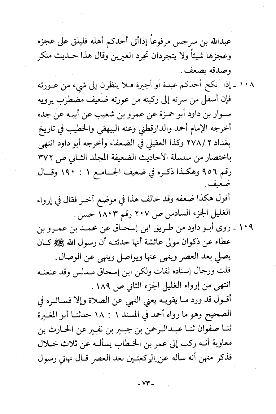 108-: «إذا أنكح أحدكم عبده أو أجيره فلا ينظرن إلى شيء من عورته فإن أسفل من سرته إلى ركبته من عورته. ضعيف مضطرب يرويه سوار بن داود أبو حمزة عن عمرو بن شعيب عن أبيه عن جده. أخرجه الإمام أحمد والدارقطني وعنه البيهقي والخطيب في تاريخ بغداد (2/278) وكذا العقيلي في الضعفاء وأخرجه أبو داود. انتهى باختصار من سلسلة الأحاديث الضعيفة المجلد الثاني (ص 372) رقم (956) وهكذا ذكره في ضعيف الجامع (1: 190) وقال: ضعيف.