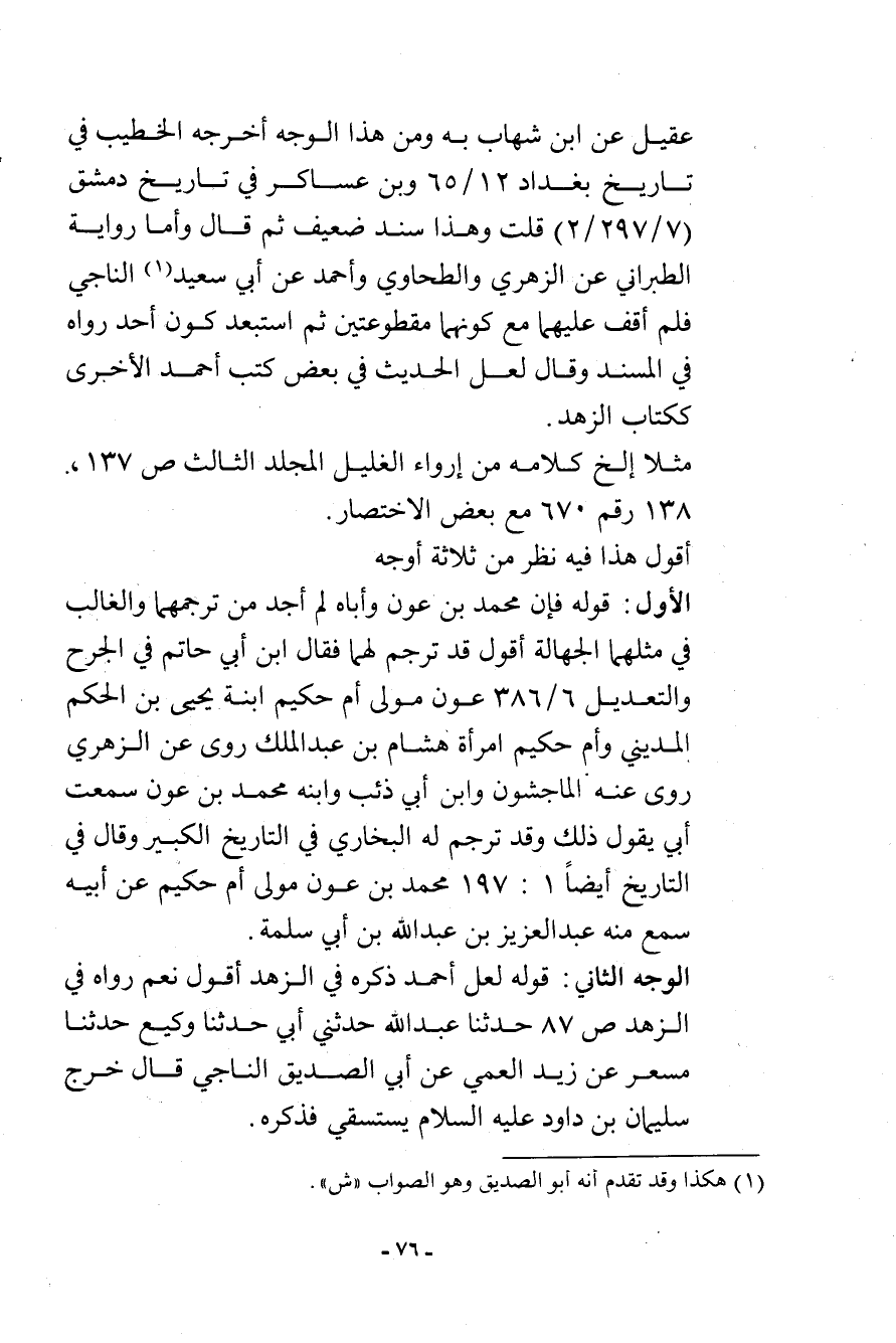 الأول: قوله فإن محمد بن عون وأباه لم أجد من ترجمها والغالب في مثلهما الجهالة أقول قد ترجم لهما فقال ابن أبي حاتم في الجرح والتعديل (6/386) عون مولى أم حكيم ابنة يحيى بن الحكم المديني وأم حكيم امرأة هشام بن عبد الملك روى عن الزهري روى عنه الماجشون وابن أبي ذئب وابنه محمد بن عون سمعت أبي يقول ذلك وقد ترجم له البخاري في التاريخ الكبير وقال في التاريخ أيضًا (1: 197) محمد بن عون مولى أم حكيم عن أبيه سمع منه عبد العزيز بن عبد الله بن أبي سلمة.