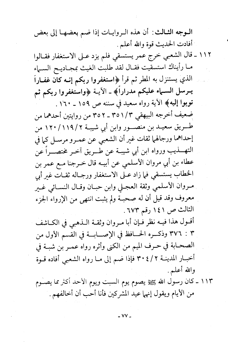 112- قال الشعبي: خرج عمر يستسقي فلم يزد على الاستغفار فقالوا: ما رأيناك استسقيت فقال: لقد طلبت الغيث بمجاديح السماء الذي يستنزل به المطر ثم قرأ {اسْتَغْفِرُوا رَبَّكُمْ إِنَّهُ كَانَ غَفَّاراً * يُرْسِلِ السَّمَاء عَلَيْكُم مِّدْرَاراً} - الآية {وَاسْتَغْفِرُواْ رَبَّكُمْ ثُمَّ تُوبُواْ إِلَيْهِ} الآية رواه سعيد في سننه (ص 159 - 160) .