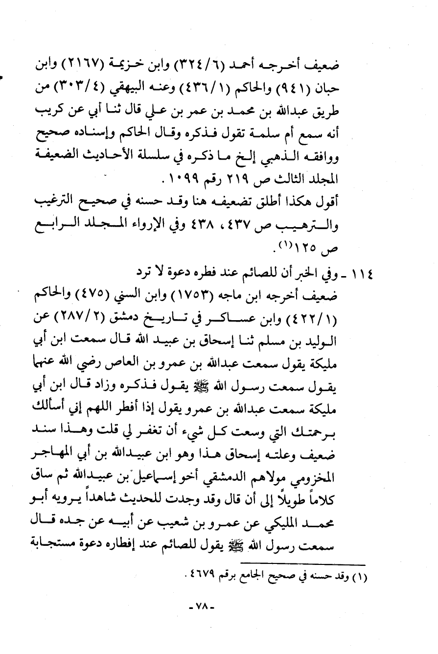 114- وفي الخبر أن للصائم عند فطره دعوة لا ترد: ضعيف أخرجه ابن ماجة (1753) ، وابن السني (475) ، والحاكم (1/422) ، وابن عساكر في تاريخ دمشق (2/287) عن الوليد بن مسلم ثنا إسحاق بن عبيد الله قال: سمعت ابن أبي مليكة يقول: سمعت عبد الله بن عمرو بن العاص رضي الله عنهما يقول: سمعت رسول الله - صلى الله عليه وسلم - يقول ... فذكره، وزاد قال ابن أبي مليكة سمعت عبد الله بن عمرو يقول إذا أفطر: اللهم إني أسألك برحمتك التي وسعت كل شيء أن تغفر لي. قلت: وهذا سند ضعيف وعلته إسحاق هذا وهو ابن ... عبيد الله بن أبي المهاجر المخزومي مولاهم الدمشقي أخو إسماعيل بن عبيد الله ثم ساق كلامًا طويلاً إلى أن قال: وقد وجدت للحديث شاهدًا يرويه أبو محمد المليكي عن عمرو بن شعيب عن أبيه عن جده قال: سمعت رسول الله - صلى الله عليه وسلم - يقول: للصائم عند إفطاره دعوة مستجابة