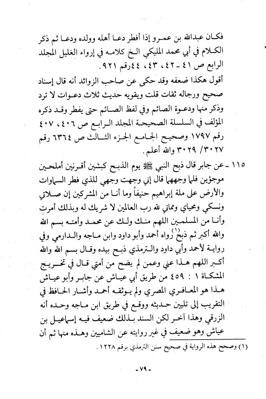 115- عَنْ جَابِرِ قَالَ: ذَبَحَ النَّبِيُّ - صلى الله عليه وسلم - يَوْمَ الذَّبْحِ كَبْشَيْنِ أَقْرَنَيْنِ أَمْلَحَيْنِ مُوجَأيْنِ فَلَمَّا وَجَّهَهُمَا قَالَ: «إِنِّي وَجَّهْتُ وَجْهِيَ لِلَّذِي فَطَرَ السَّمَوَاتِ وَالأَرْضَ عَلَى مِلَّةِ إِبْرَاهِيمَ حَنِيفًا وَمَا أَنَا مِنْ الْمُشْرِكِينَ إِنَّ صَلَاتِي وَنُسُكِي وَمَحْيَايَ وَمَمَاتِي لِلَّهِ رَبِّ الْعَالَمِينَ لا شَرِيكَ لَهُ وَبِذَلِكَ أُمِرْتُ وَأَنَا مِنْ الْمُسْلِمِينَ اللَّهُمَّ مِنْكَ وَلَكَ. عَنْ مُحَمَّدٍ وَأُمَّتِهِ بِاسْمِ اللَّهِ وَاللَّهُ أَكْبَرُ ثُمَّ ذَبَحَ» . (¬1) . رواه أحمد، وأبو داود، وابن ماجة، والدارمي وفي رواية لأحمد وأبي داود والترمذي ذبح بيده وقال: بسم الله والله أكبر اللهم هذا عني وعمن لم يضح من أمتي» . قال في تخريج المشكاة (1: 459) من طريق أبي عياش عن جابر. وأبو عياش هذا هو المعافري المصري ولم يوثقه أحمد وأشار الحافظ في التقريب إلى تليين حديثه. ووقع في طريق ابن ماجة وحده أنه الزرقي. وهذا آخر لكن السند بذلك ضعيف فيه إسماعيل بن عياش وهو ضعيف في غير روايته عن الشاميين وهذه منها ثم أن