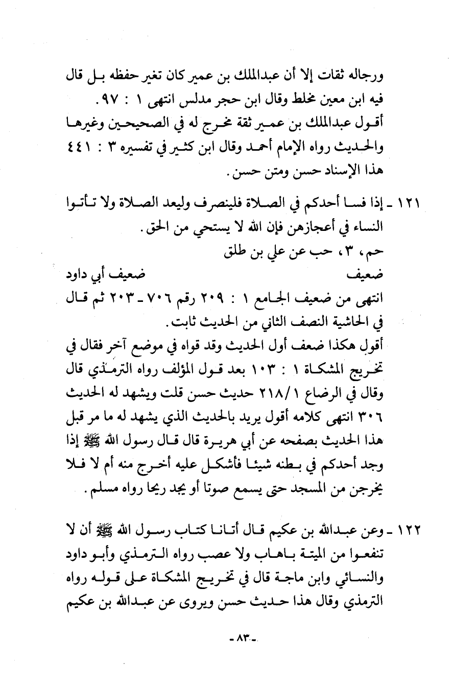 121- «إذا فسا أحدكم في الصلاة فلينصرف وليعد الصلاة، ولا تأتوا النساء في أعجازهن فإن الله لا يستحي من الحق» .