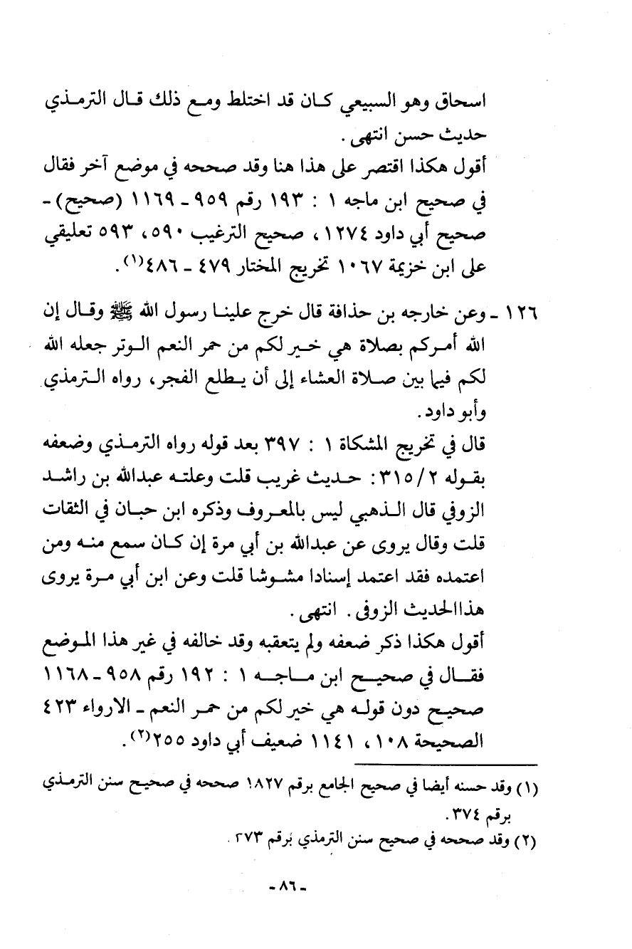 126- وعن خارجه بن حذافة قال: خرج علينا رسول الله - صلى الله عليه وسلم - وقال: «إن الله أمركم بصلاة هي خير لكم من حمر النعم الوتر جعله الله لكم فيما بين صلاة العشاء إلى أن يطلع الفجر» . رواه الترمذي وأبو داود.