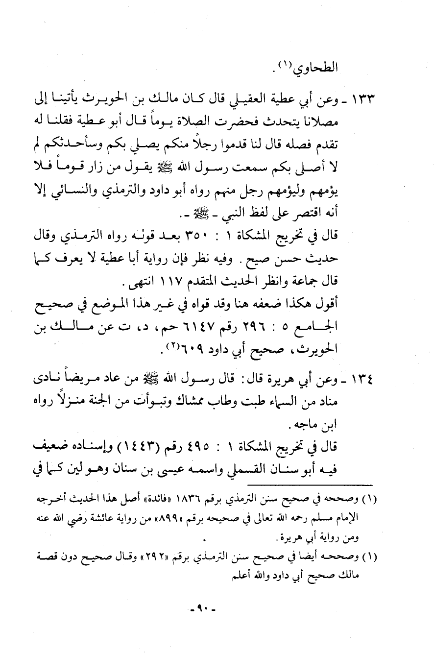 133- وعن أبي عطية العقيلي قال: كان مالك بن الحويرث يأتينا إلى مصلانا يتحدث فحضرت الصلاة يومًا قال أبو عطية: فقلنا له: تقدم فصله قال لنا: قدموا رجلاً منكم يصلي بكم وسأحدثكم لم لا أصلي بكم سمعت رسول الله - صلى الله عليه وسلم - يقول: «من زار قومًا فلا يؤمهم وليؤمهم رجل منهم» . رواه أبو داود والترمذي والنسائي إلا أنه اقتصر على لفظ النبي - صلى الله عليه وسلم -.
