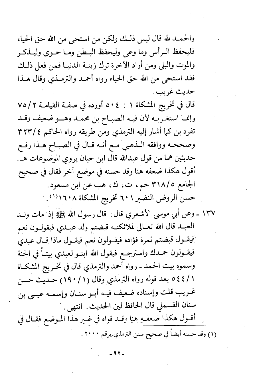 137- وَعَنْ أَبِي مُوسَى الأَشْعَرِيِّ قَالَ: قَالَ رَسُولَ اللَّهِ - صلى الله عليه وسلم -: «إِذَا مَاتَ وَلَدُ الْعَبْدِ قَالَ اللَّهُ تَعالى لِمَلائِكَتِهِ قَبَضْتُمْ وَلَدَ عَبْدِي؟ فَيَقُولُونَ: نَعَمْ، فَيَقُولُ: قَبَضْتُمْ ثَمَرَةَ فُؤَادِهِ؟ فَيَقُولُونَ: نَعَمْ، فَيَقُولُ: مَاذَا قَالَ عَبْدِي؟ فَيَقُولُونَ: حَمِدَكَ وَاسْتَرْجَعَ. فَيَقُولُ اللَّهُ: ابْنُوا لِعَبْدِي بَيْتًا فِي الْجَنَّةِ وَسَمُّوهُ بَيْتَ الْحَمْدِ» . رواه أحمد، والترمذي قال في تخريج المشكاة (1/544) بعد قوله رواه الترمذي وقال (1/190) : حديث حسن غريب. قلت: وإسناده ضعيف فيه أبو سنان وإسمه عيسى بن سنان القسملي قال الحافظ: لين الحديث. انتهى.