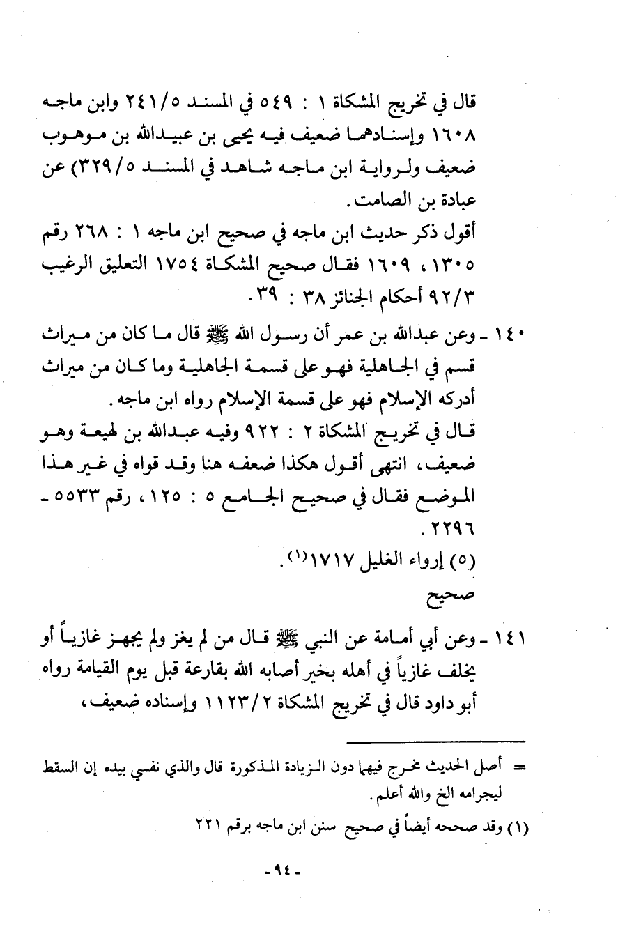 140- وعن عبد الله بن عمر أن رسول الله - صلى الله عليه وسلم - قال: (ما كان من ميراث قسم في الجاهلية فهو على قسمة الجاهلية وما كان من ميراث أدركه الإسلام فهو على قسمة الإسلام) . رواه ابن ماجة.
