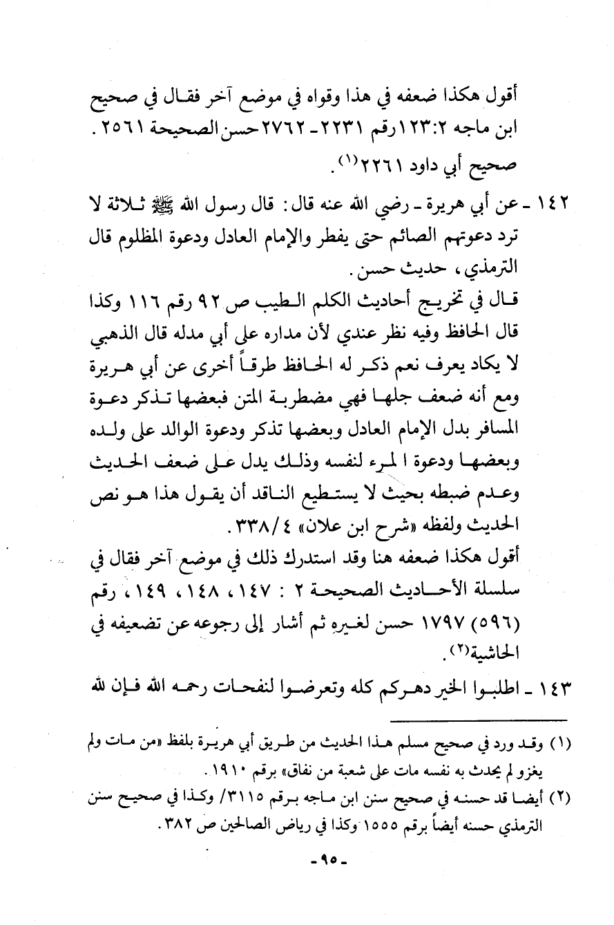 142- عن أبي هريرة - رضي الله عنه قال: قال رسول الله - صلى الله عليه وسلم -: «ثلاثة لا ترد دعوتهم الصائم حتى يفطر والإمام العادل ودعوة المظلوم» . قال الترمذي: حديث حسن.