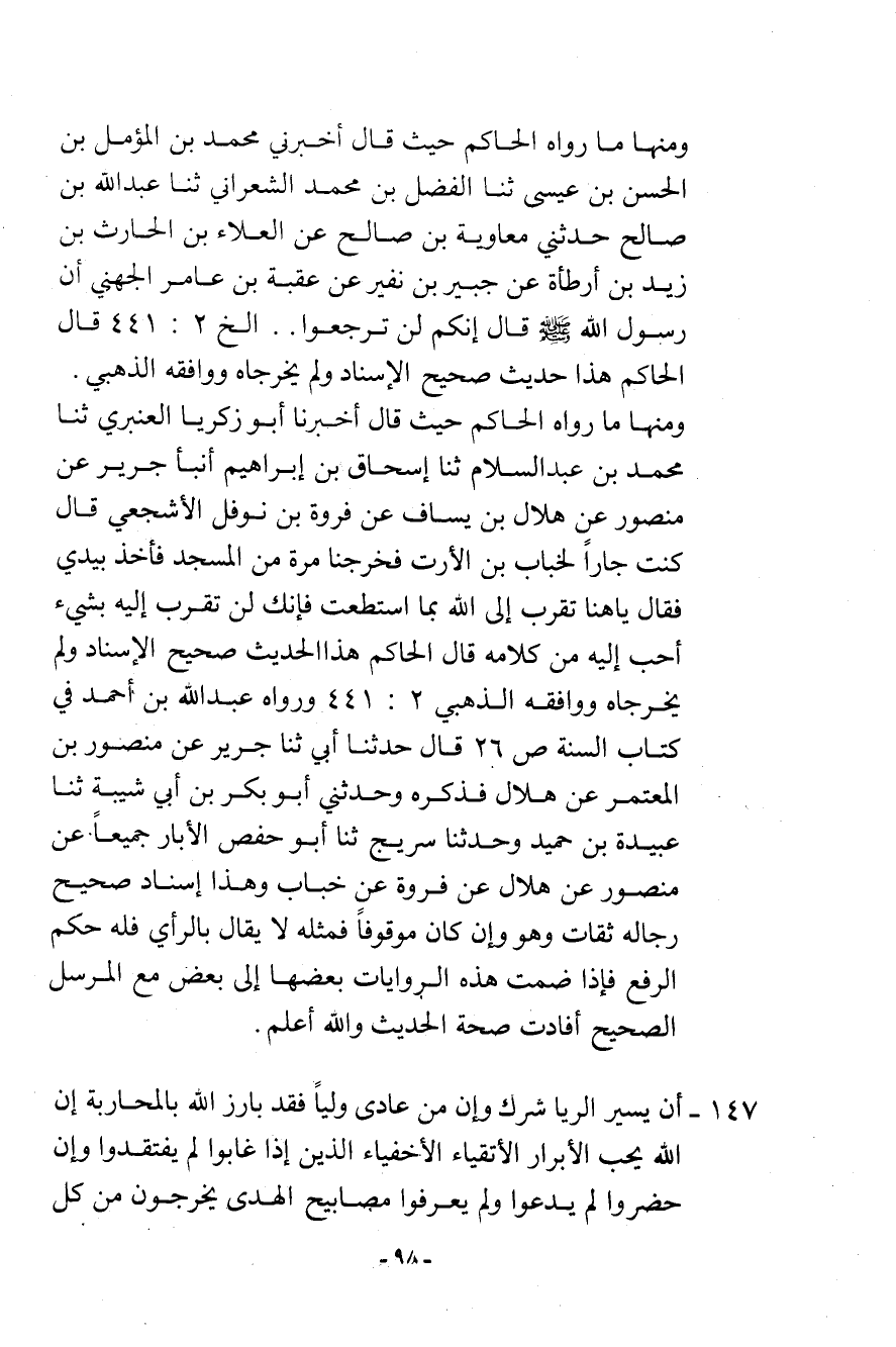 147-: «إن يسير الرياء شرك من عادى وليًا فقد بارز الله بالمحاربة. إن الله يحب الأبرار الأتقياء الأخفياء الذين إذا غابوا لم يفتقدوا وإن حضروا لم يدعوا ولم يعرفوا مصابيح الهدي يخرجون من كل