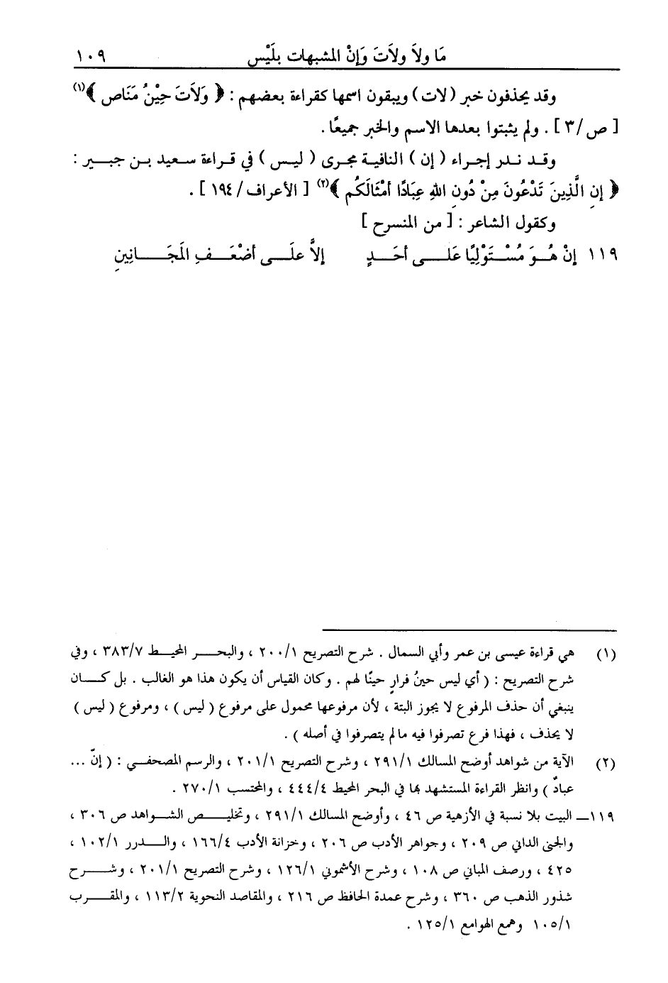 وقد ندر إجراء (إن) النافية مجرى (ليس) في قراءة سعيد بن جبير: (إن الذين تدعون من دون الله عبادًا أمثالكم) [الأعراف / 194].