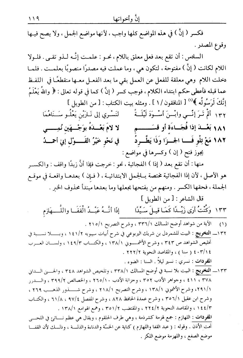 السادس: أن تقع بعد فعل معلق باللام، نحو: علمت إنه لذو تقى. فلولا اللام لكانت (إن) مفتوحة، لتكون هي، وما عملت فيه مصدرًا منصوبًا بعلمت. فلما دخلت اللام وهي معلقة للفعل عن العمل بقي ما بعد الفعل معها منقطعًا في اللفظ عما قبله فأعطى حكم ابتداء الكلام، فوجب كسر (إن) كما في قوله تعالى: (والله يعلم إنك لرسوله) [المنافقون /1]. ومثله بيت الكتاب: [من الطويل]