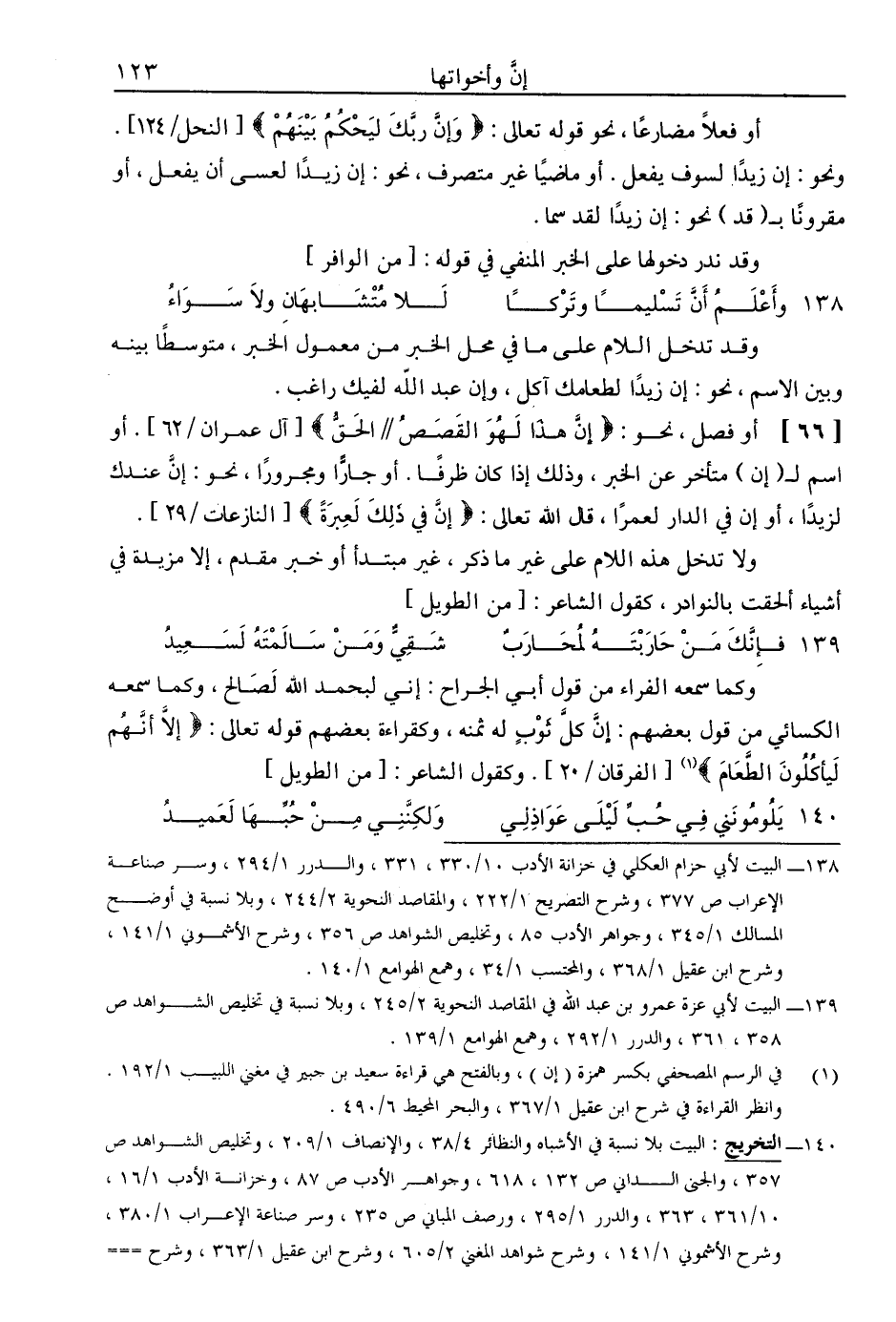 [66] أو فصل، نحو: (إن هذا لهو القصص // الحق) [آل عمران /62]. أو اسم لـ (إن) متأخر عن الخبر، وذلك إذا كان ظرفًا. أو جارًا ومجرورًا، نحو: إن عندك لزيدًا، أو إن في الدار لعمرًا، قال الله تعالى: (إن في ذلك لعبرةً) [النازعات /29].