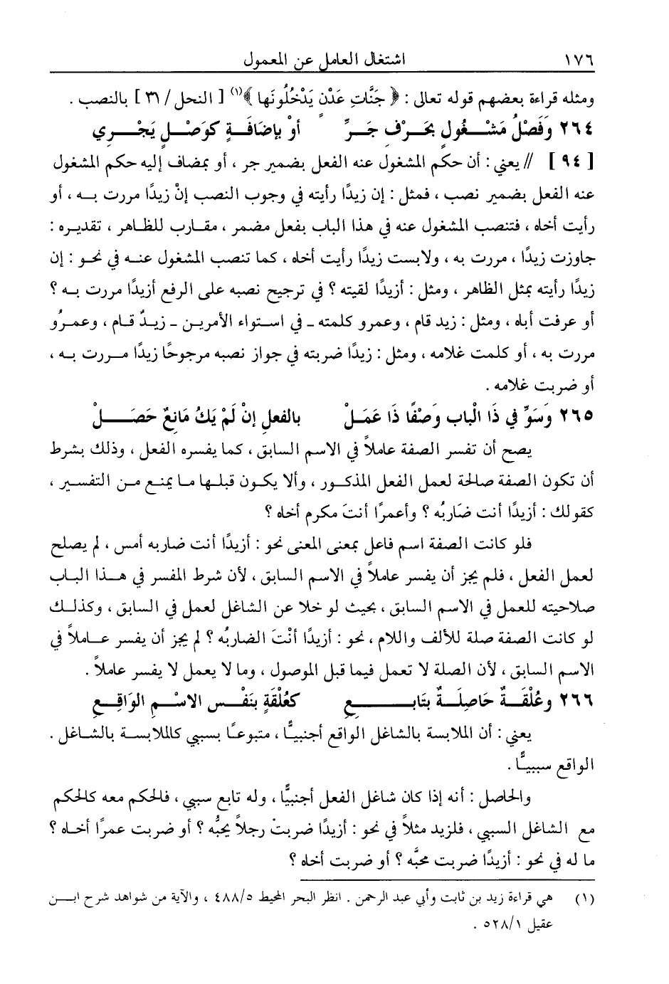 [94] // يعني: أن حكم المشغول عنه الفعل بمضير جر، أو بمضاف إليه حكم المشغول عنه الفعل بضمير نصب، فمثل: إن زيدًا رأيته في وجوب النصب إن زيدًا مررت به، أو رأيت أخاه، فتنصب المشغول عنه في هذا الباب بفعل مضمر، مقارب للظاهر، تقديره: جاوزت زيدًا، مررت به، ولابست زيدًا رأيت أخاه، كما تنصب المشغول عنه في نحو: إن زيدًا رأيته بمثل الظاهر، ومثل: أزيدًا لقيته؟ في ترجيح نصبه على الرفع أزيدًا مررت به؟ أو عرفت أباه، ومثل: زيد قام، وعمرو كلمته - في استواء الأمرين - زيد قام، وعمرو مررت به، أو كلمت غلامه، ومثل: زيدًا ضربته في جواز نصبه مرجوحًا زيدًا مررت به، أو ضربت غلامه.