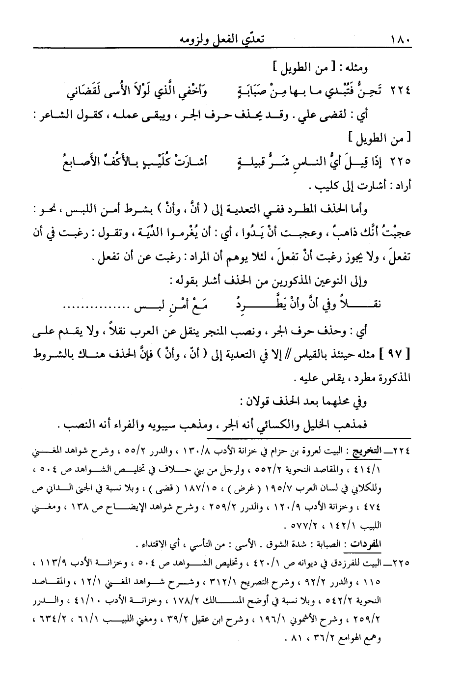 وأما الحذف المطرد ففي التعدية إلى (أنَّ، وأنْ) بشرط أمن اللبس، نحو: عجبت أنك ذاهب، وعجبت أن يدوا، أي: أن يغرموا الدية، وتقول: رغبت في أن تفعل، ولا يجوز رغبت أن تفعل، لئلا يوهم أن المراد: رغبت عن أن تفعل.