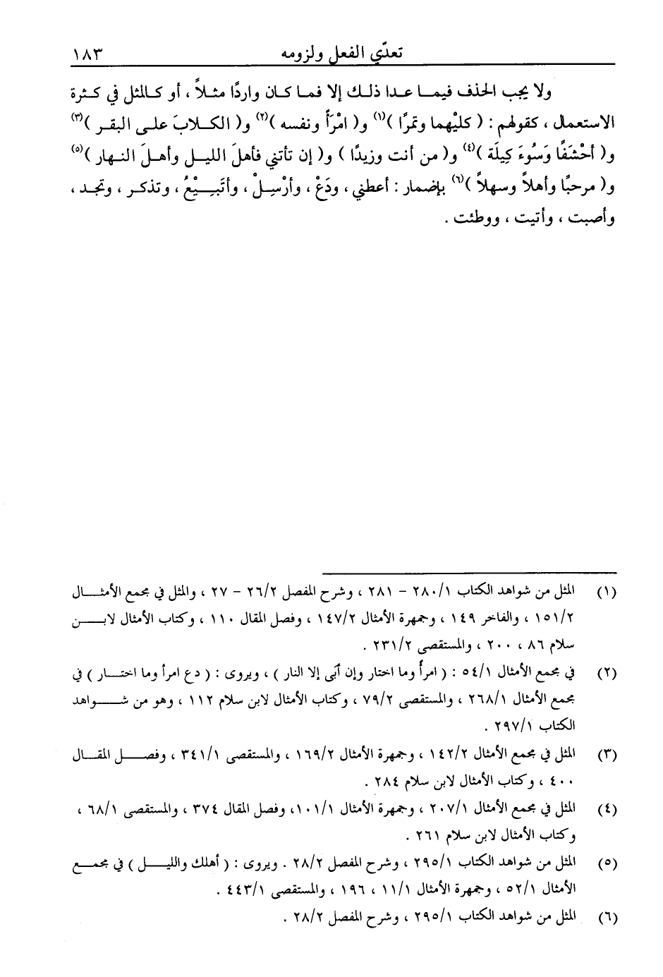ولا يجب الحذف فيما عدا ذلك إلا فما كان واردًا مثلا، أو كالمثل في كثرة الاستعمال، كقولهم: (كليهما وتمرًا) و (أمرا ونفسه) و (الكلاب على البقر) و (أحشفًا وسوء كيلة) و (من أنت وزيدًا) و (إن تأتني فأهل الليل وأهل النهار) و (مرحبًا وأهلا وسهلا) بإضمار: أعطني، ودع، وأرسل، وأتبيع، وتذكر، وتجد، وأصبت، وأتيت، ووطئت.
