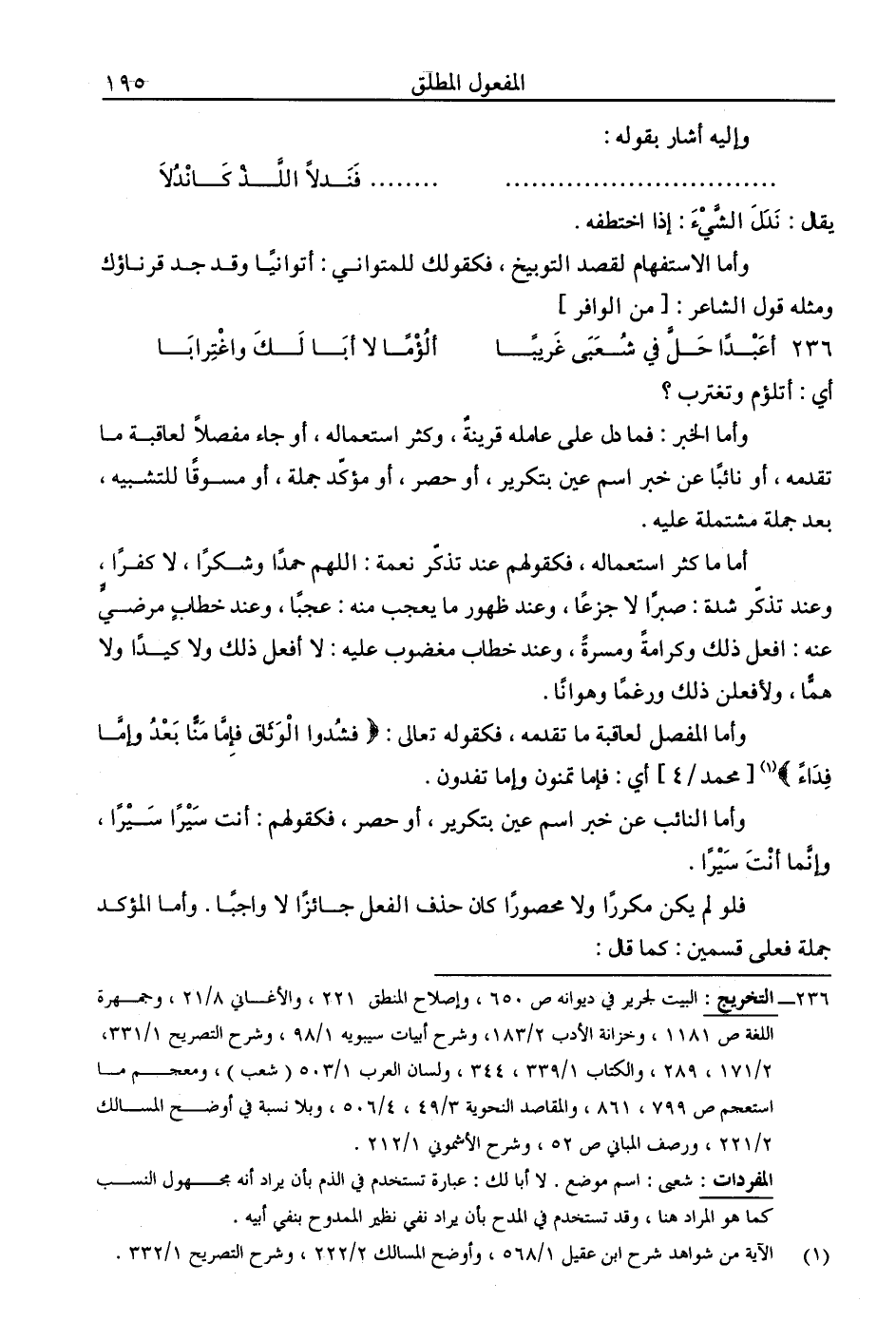 أما ما كثر استعماله، فكقولهم عند تذكر نعمة: اللهم حمدًا وشكرًا، لا كفرًا، وعند تذكر شدة: صبرًا لا جزعًا، وعند ظهور ما يعجب منه: عجبًا، وعند خطابٍ مرضي عنه: افعل ذلك وكرامةً ومسرةً، وعند خطاب مغضوب عليه: لا أفعل ذلك ولا كيدًا ولا هما، ولأفعلن ذلك ورغمًا وهوانًا.
