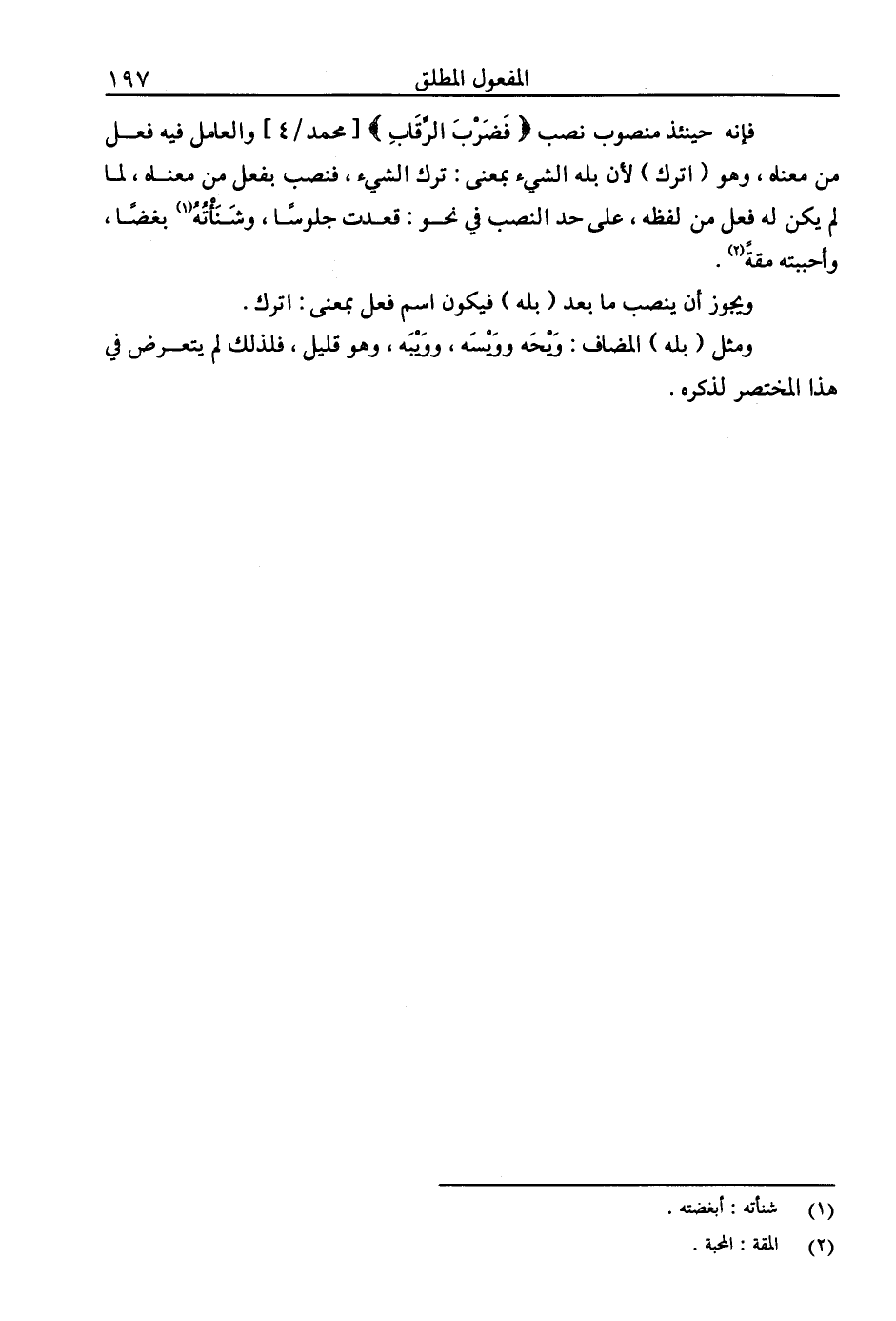 فإنه حينئذ منصوب نصب (فضرب الرقاب) [محمد /4] والعامل فيه فعل من معناه، وهو (اترك) لأن بله الشيء بمعنى: ترك الشيء، فنصب بفعل من معناه، لما لم يكن له فعل من لفظه، على حد النصب في نحو: قعدت جلوسًا، وشنأته بغضًا، وأحببته مقةً.