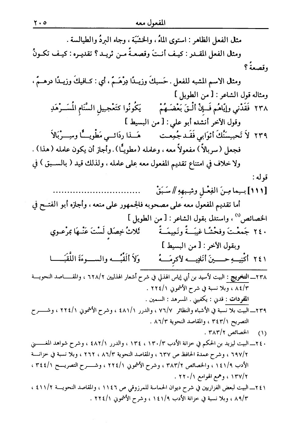 أما تقديم المفعول معه على مصحوبه فالجمهور على منعه، وأجازه أبو الفتح في الخصائص، واستدل بقول الشاعر: [من الطويل]